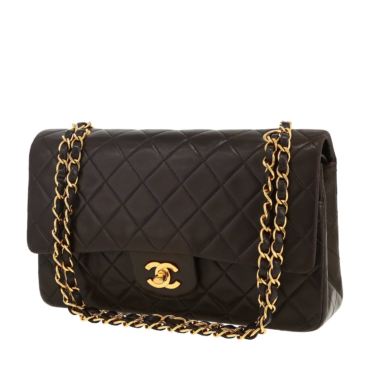 Unavoidable Chanel Timeless Classic handbag in black quilted leather, hardware in gilt metal, one chain strap in gilt metal interwoven with black leather allowing the bag to be worn in the hand or on the shoulder.
