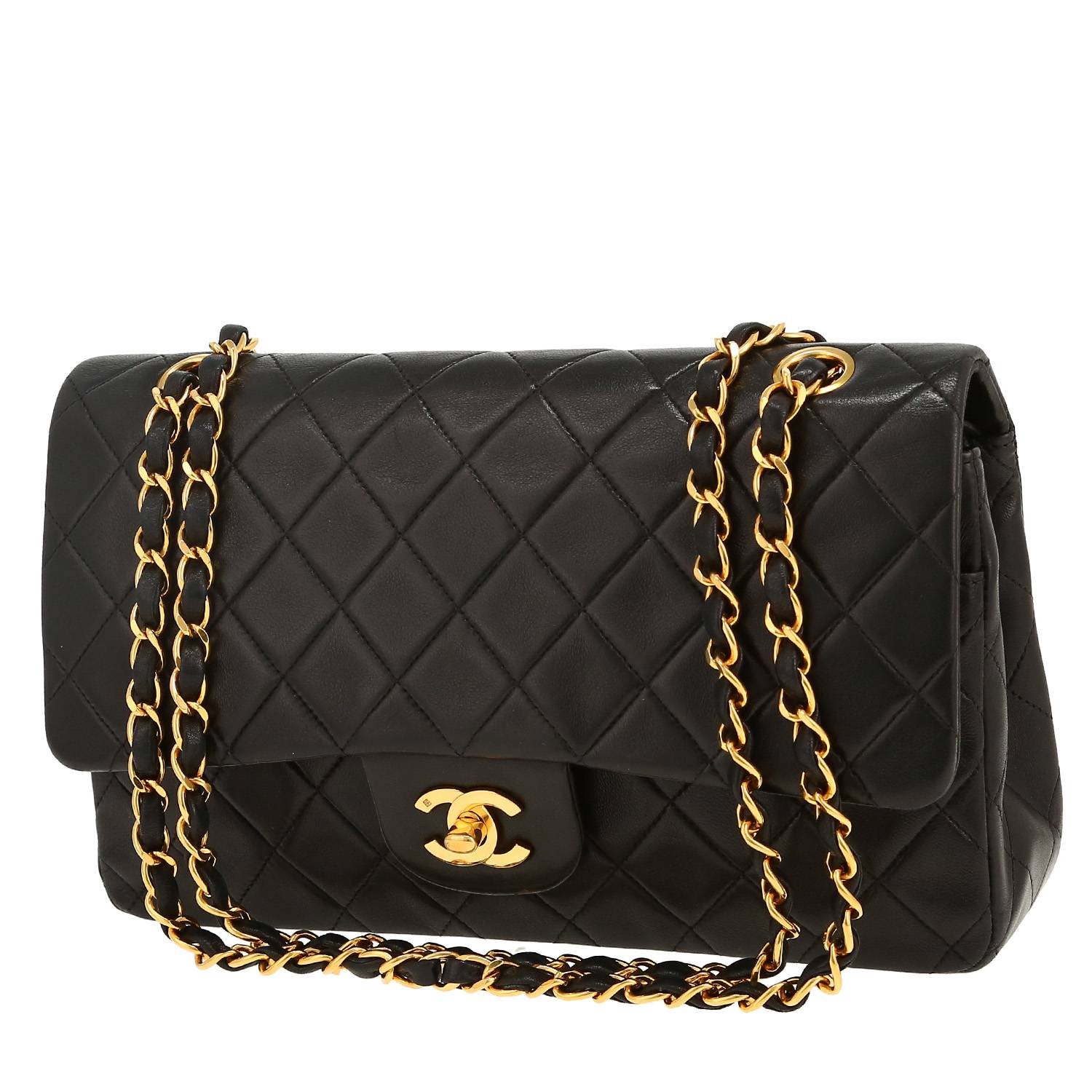 Wonderful Chanel Timeless Classic handbag in black quilted leather, hardware in gilt metal, one chain strap in gilt metal interwoven with black leather allowing the bag to be worn in the hand or on the shoulder.