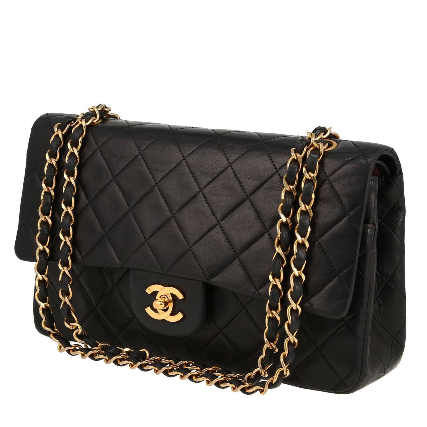 Elegant Chanel Timeless Classic handbag in black quilted leather, hardware in gilt metal, one chain strap in gilt metal interwoven with black leather allowing the bag to be worn in the hand or on the shoulder.
