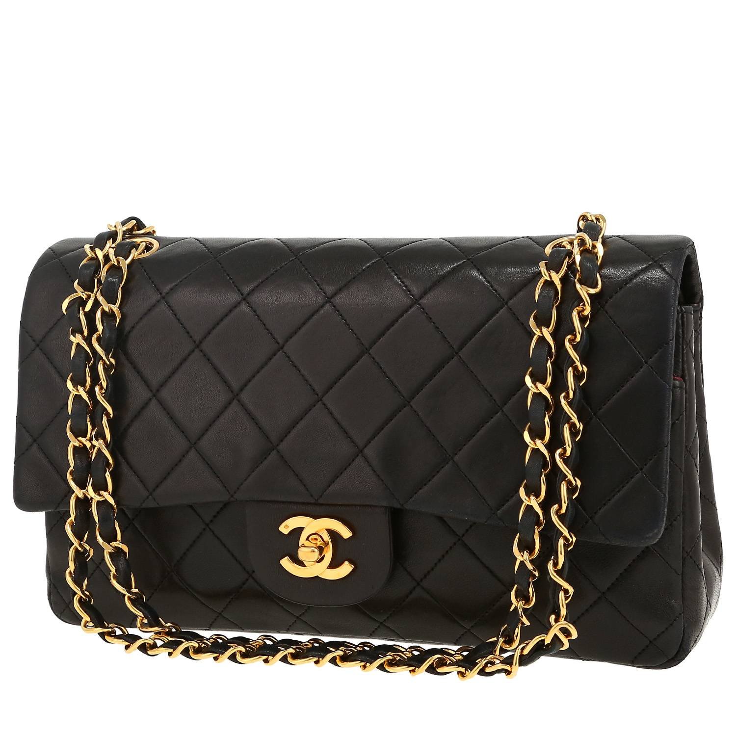 Wonderful Chanel Timeless Classic handbag in black quilted leather, hardware in gilt metal, one chain strap in gilt metal interwoven with black leather allowing the bag to be worn in the hand or on the shoulder.