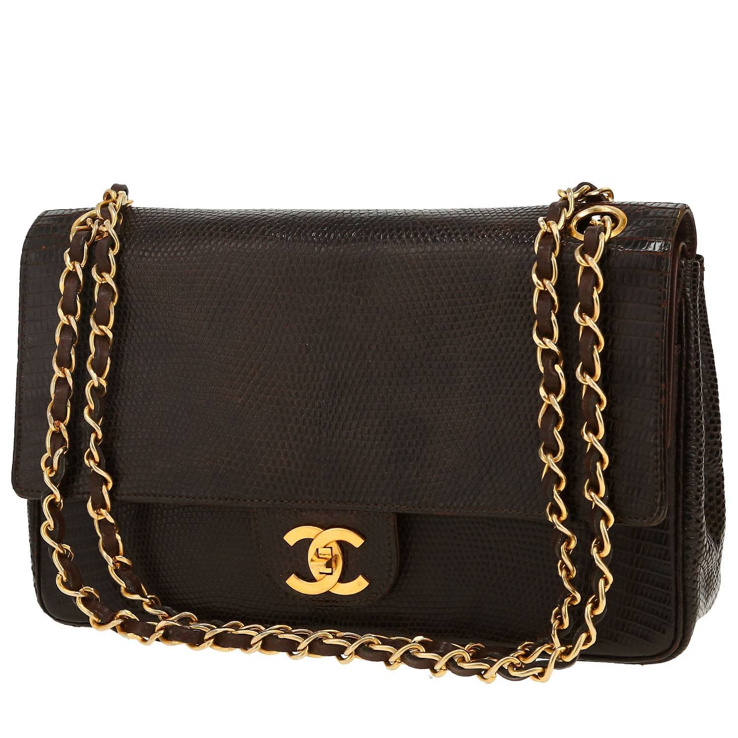 Wonderful Chanel Timeless Classic handbag in brown lizzard, hardware in gilt metal, one convertible chain strap in gilt metal interwoven with brown leather allowing the bag to be worn in the hand or on the shoulder.