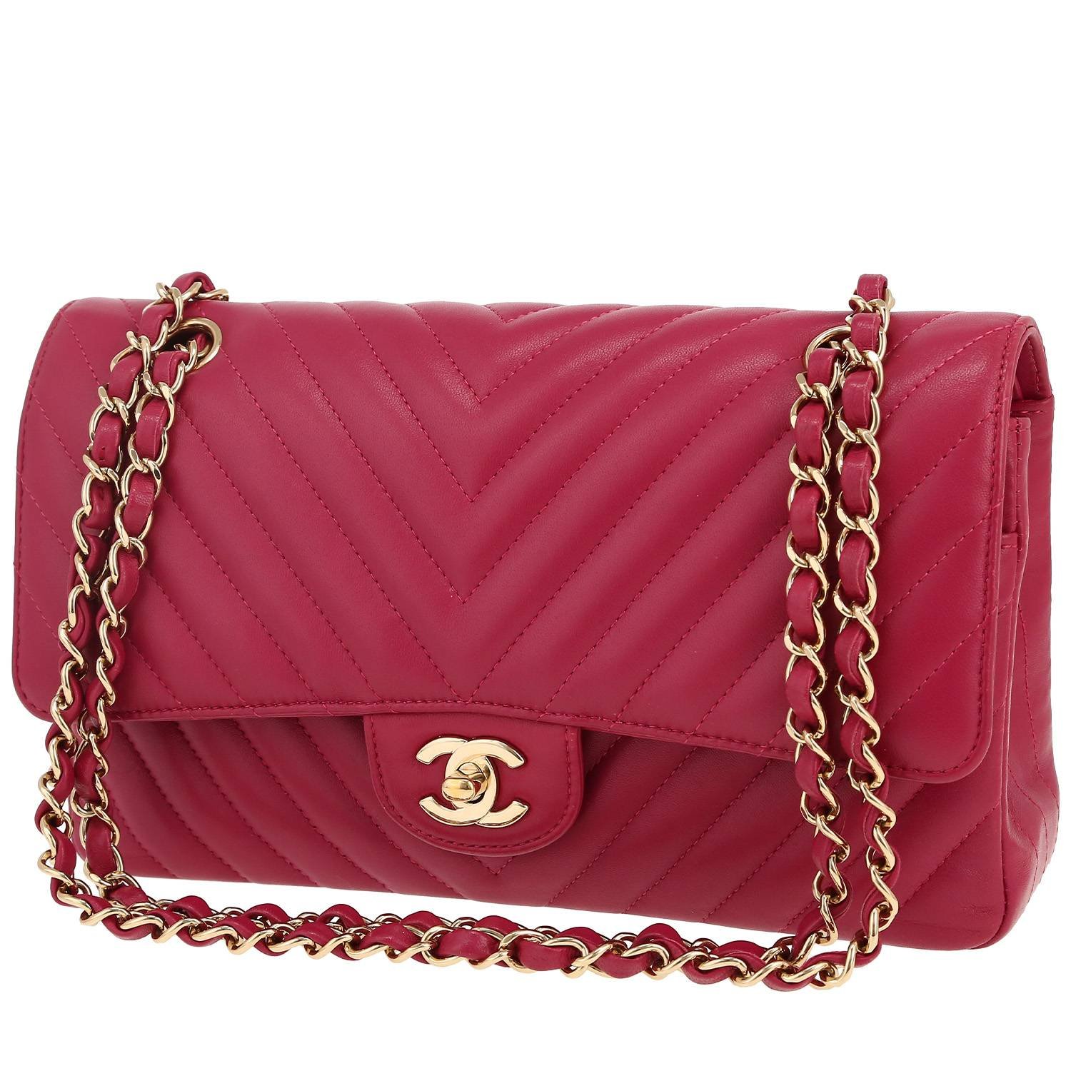 Wonderful Chanel Timeless Classic handbag in fushia pink chevron quilted leather, hardware in gilt metal, one chain strap in gilt metal interwoven with fushia pink leather allowing the bag to be worn in the hand or on the shoulder.