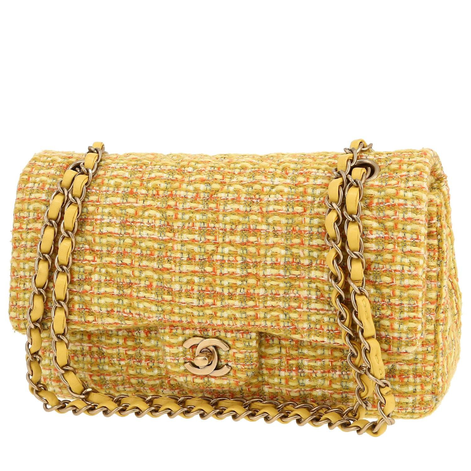 Wonderful Chanel Timeless Classic handbag in yellow and green tweed, hardware in gilt metal, one chain strap in gilt metal interwoven with yellow leather allowing the bag to be worn in the hand or on the shoulder.