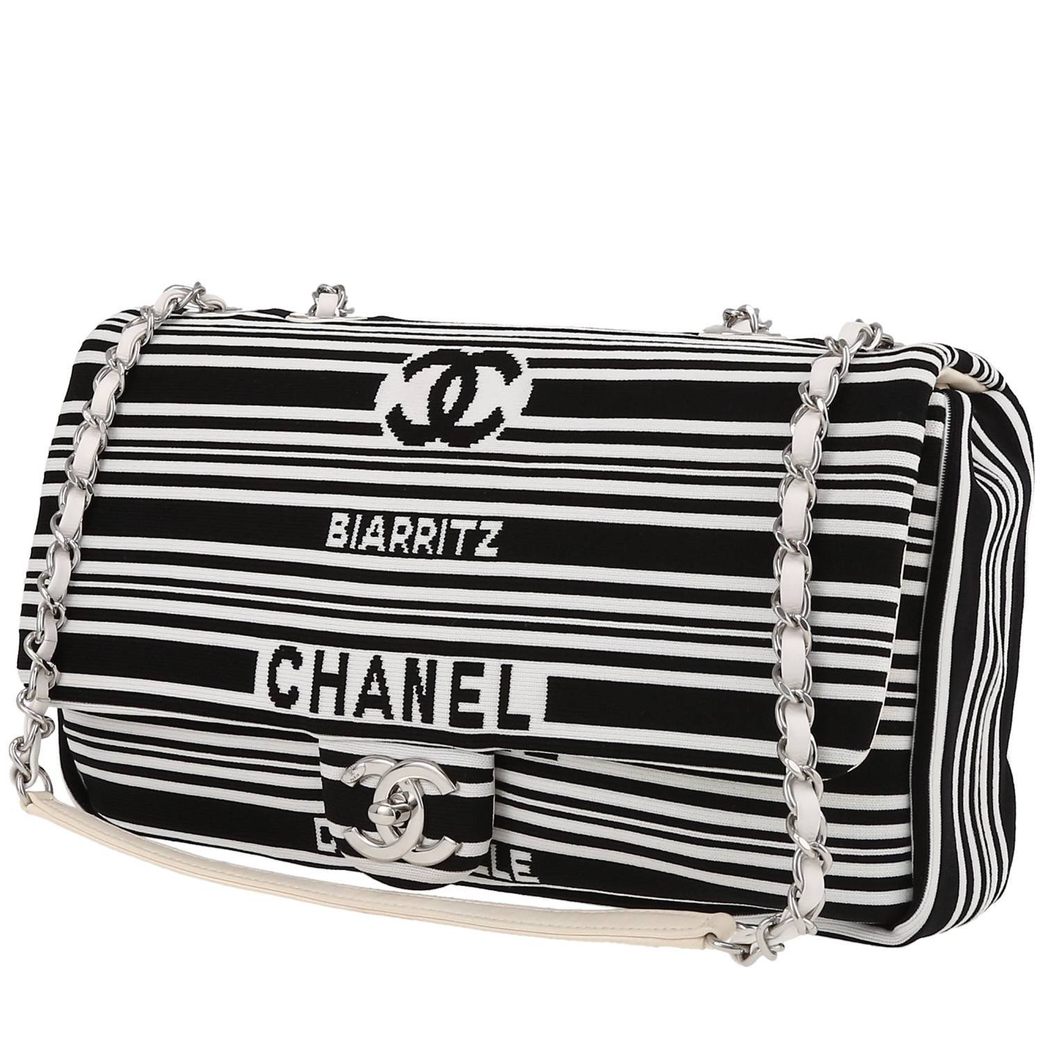 Elegant Chanel Timeless handbag in black and white canvas, hardware in silver metal, one chain strap in silver metal interwoven with white leather allowing the bag to be worn in the hand or on the shoulder or accross the body.