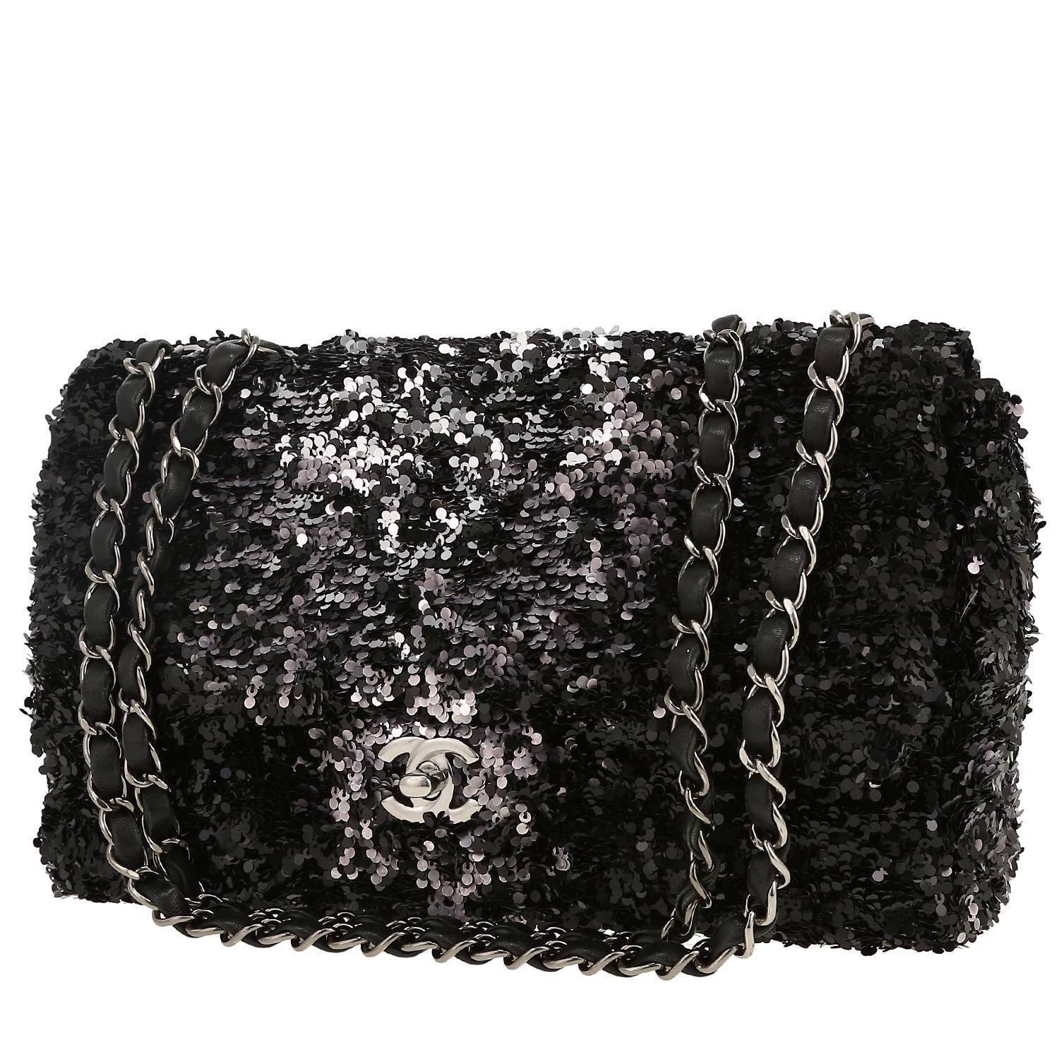 Elegant Chanel Timeless handbag in black leather embroidered with sequins, hardware in silver metal, one chain strap in silver metal interwoven with black leather allowing the bag to be worn in the hand or on the shoulder.