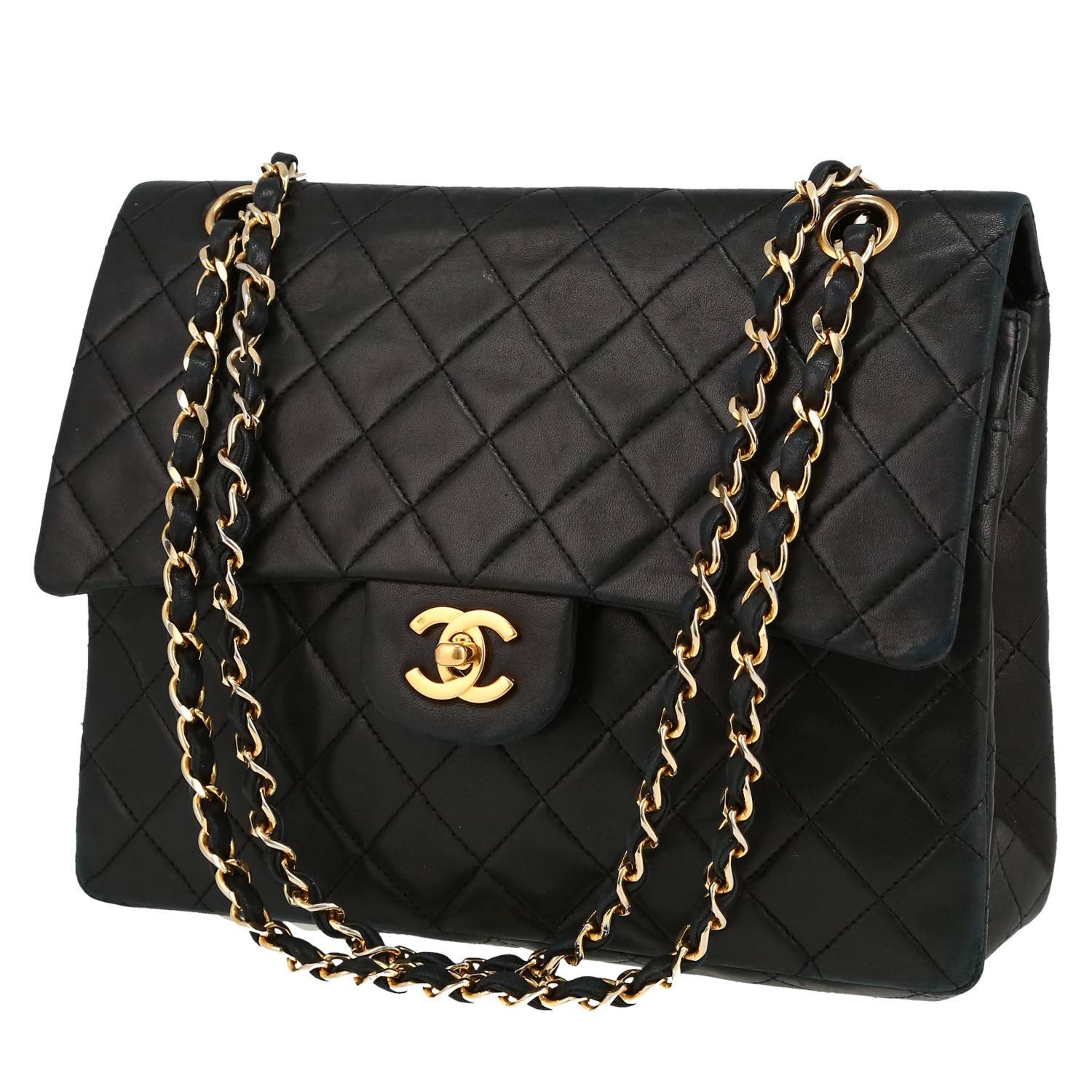 Elegant Chanel Timeless handbag in black quilted leather, hardware in gilt metal, one chain strap in gilt metal interwoven with black leather allowing the bag to be worn in the hand or on the shoulder.