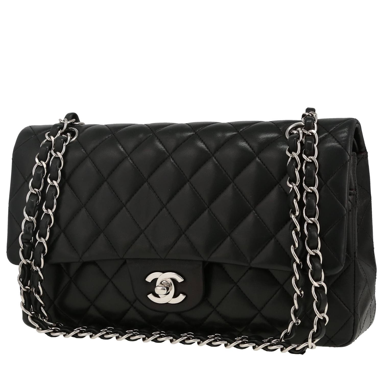 Elegant Chanel Timeless handbag in black quilted leather, hardware in silver metal, one chain strap in silver metal interwoven with black leather allowing the bag to be worn in the hand or on the shoulder.