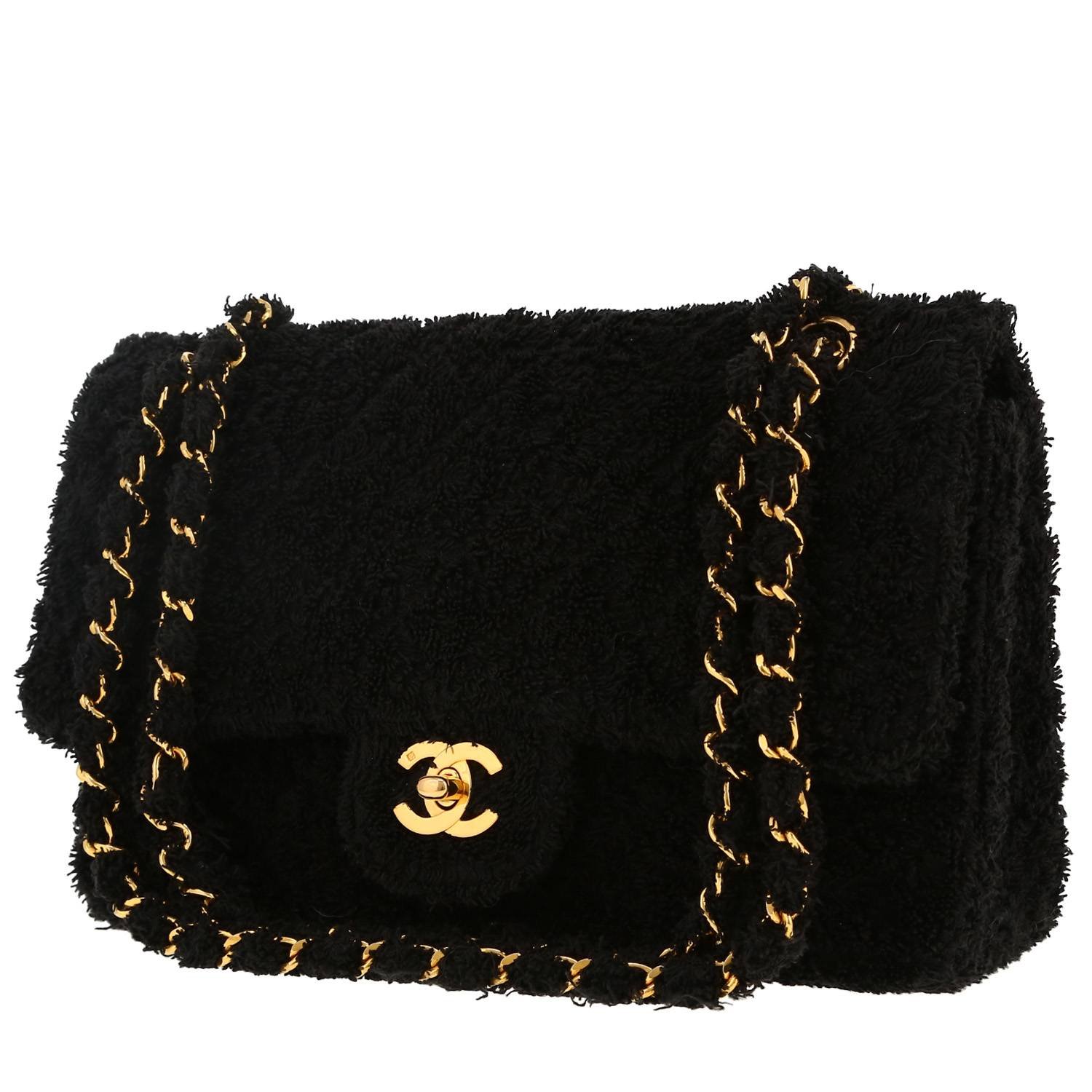 Elegant Chanel Timeless handbag in black terry fabric, hardware in gilt metal, one chain strap in gilt metal interwoven with black terry fabric allowing the bag to be worn in the hand or on the shoulder.