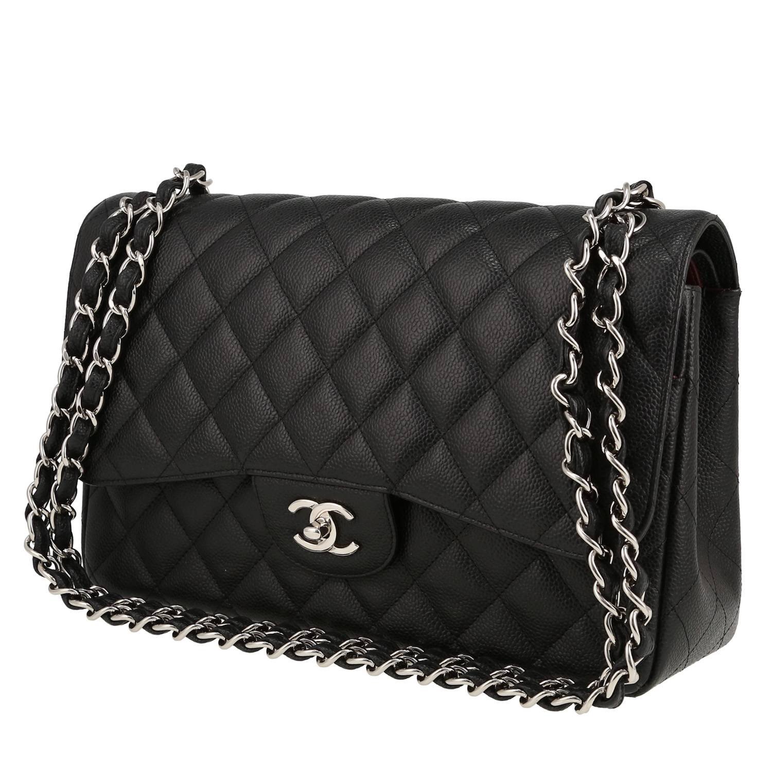Splendid Chanel Timeless Jumbo handbag in black quilted grained leather, hardware in silver metal, one chain strap in silver metal interwoven with black leather allowing the bag to be worn in the hand or on the shoulder or accross the body.