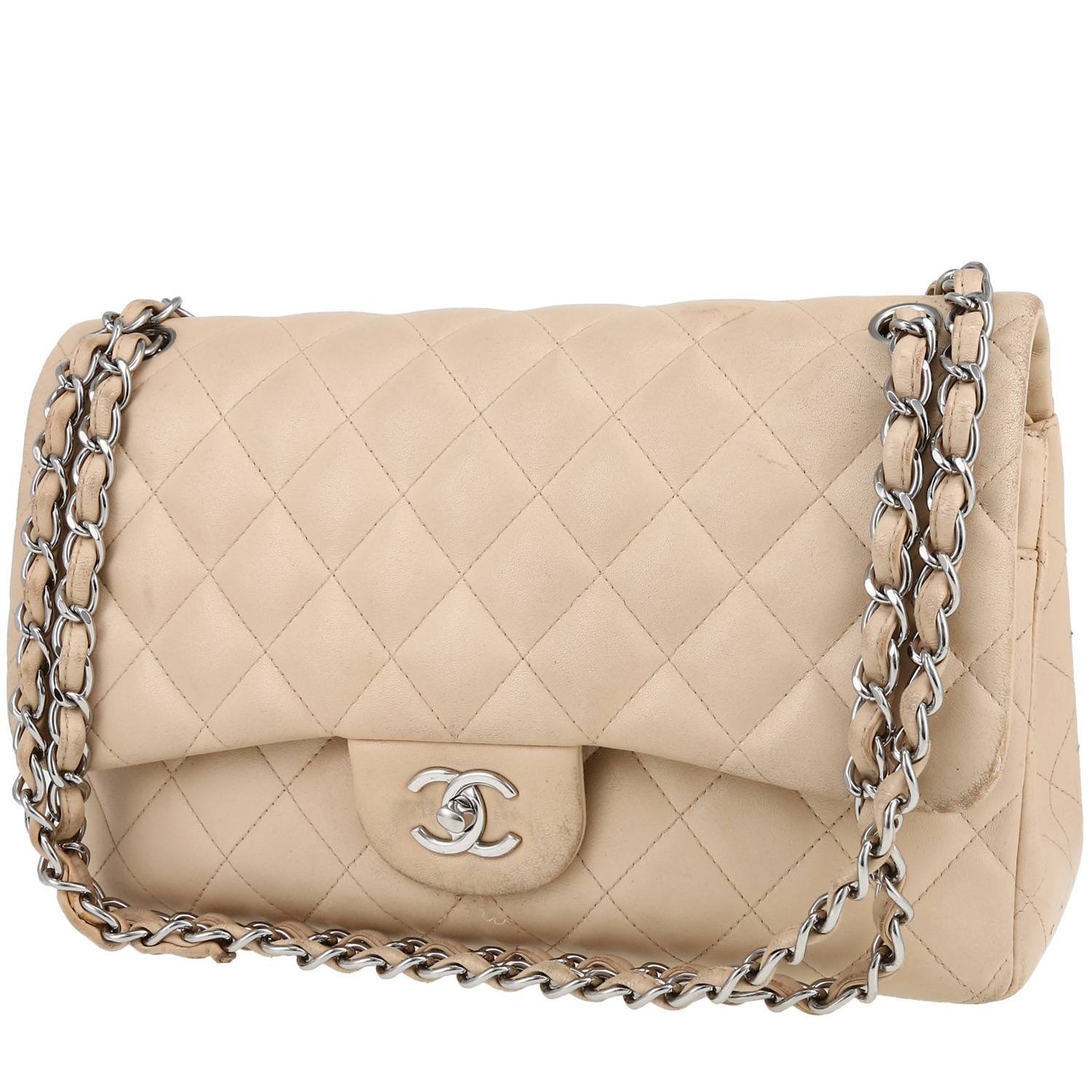 Unavoidable Chanel Timeless Jumbo shoulder bag in beige quilted leather, hardware in silver metal, chain strap in silver metal interwoven with beige leather allowing the bag to be worn in the hand or on the shoulder or accross the body.