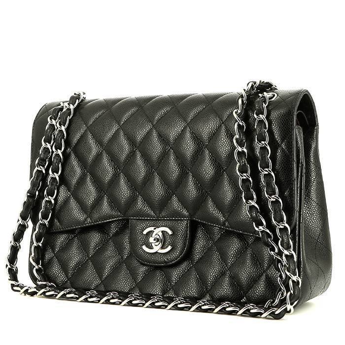 Elegant Chanel Timeless Jumbo shoulder bag in black quilted grained leather, hardware in silver metal, chain strap in silver metal interwoven with black leather allowing the bag to be worn in the hand or on the shoulder or accross the body.