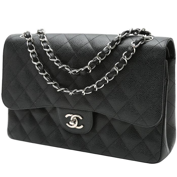 Magnificent Chanel Timeless Jumbo shoulder bag in black quilted grained leather, hardware in silver metal, chain strap in silver metal interwoven with black leather allowing the bag to be worn in the hand or on the shoulder or accross the body.