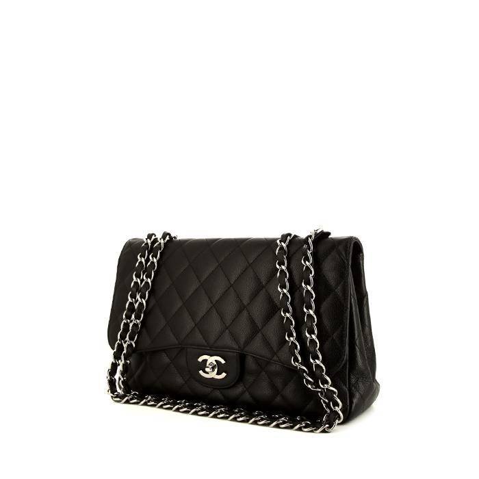 Timeless Chanel Timeless Jumbo shoulder bag in black quilted grained leather, hardware in silver metal, convertible chain strap in silver metal interwoven with black leather allowing the bag to be worn on the shoulder or accross the body.