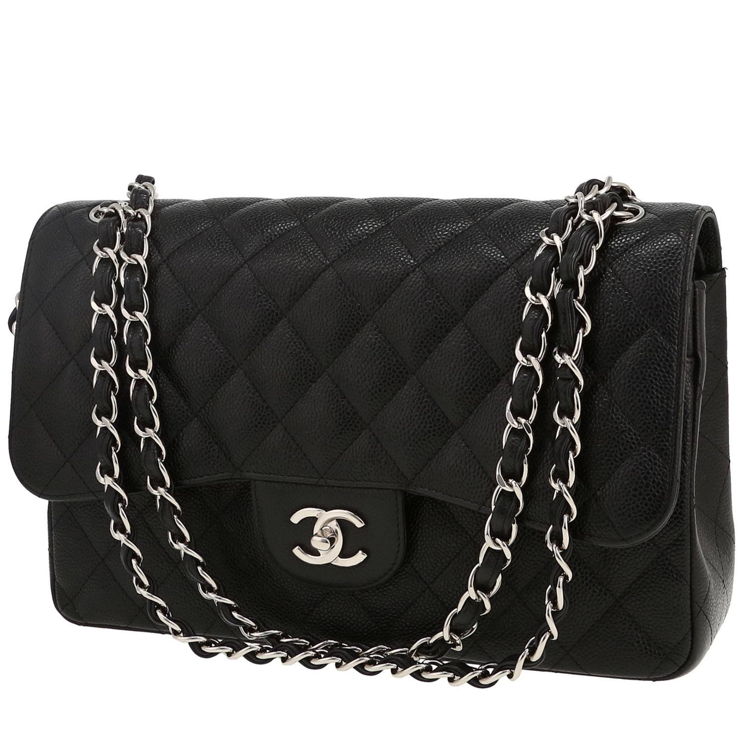 Splendid Chanel Timeless Jumbo shoulder bag in black quilted grained leather, hardware in silver metal, one chain strap in silver metal interwoven with black leather allowing the bag to be worn in the hand or on the shoulder or accross the body.