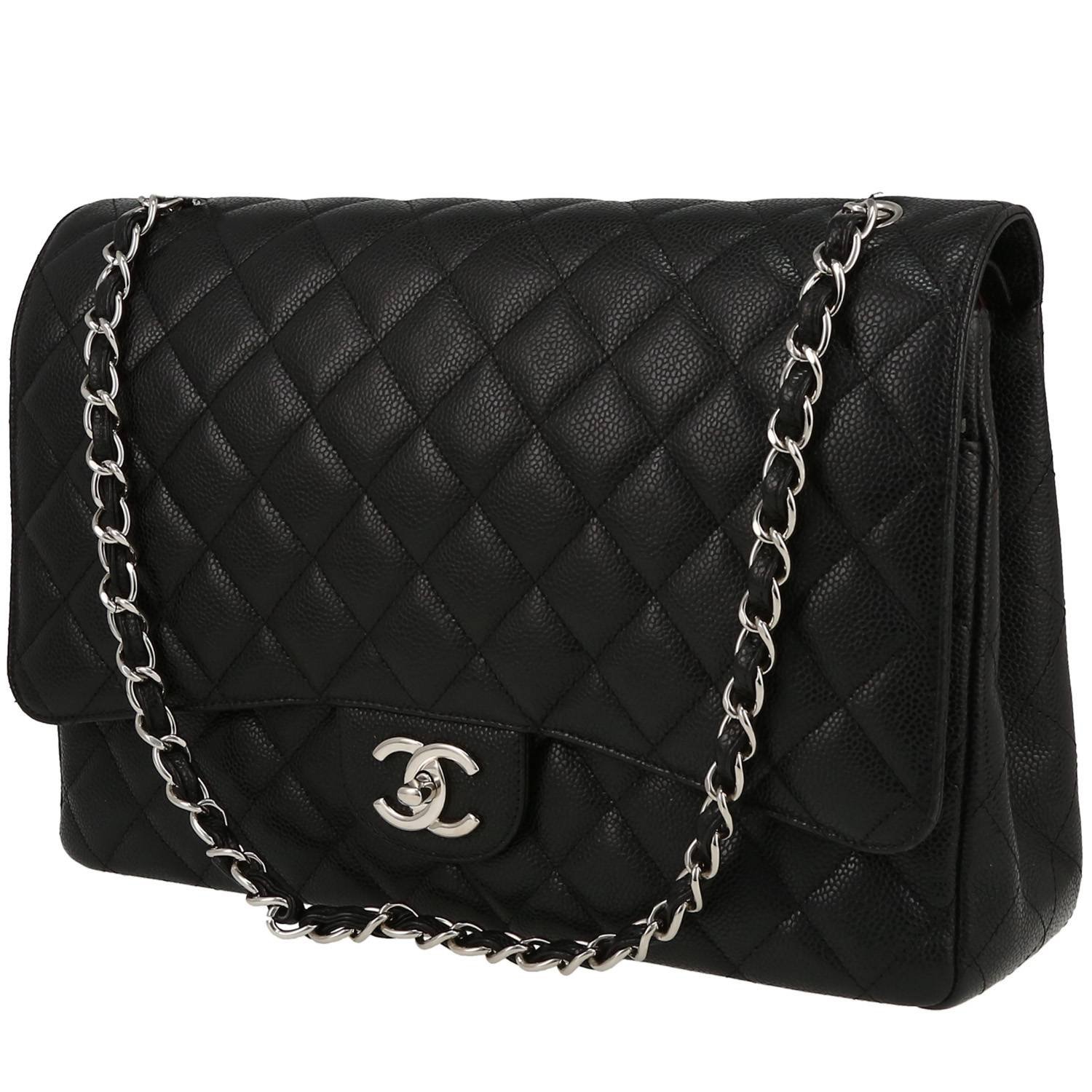 Unavoidable Chanel Timeless Maxi Jumbo handbag in black quilted grained leather, hardware in silver metal, convertible chain strap in silver metal interwoven with black leather allowing the bag to be worn in the hand or on the shoulder or accross the body.