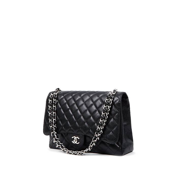Superb Chanel Timeless Maxi Jumbo handbag in black quilted leather, hardware in silver metal, double convertible chain strap in silver metal interwoven with black leather allowing the bag to be worn in the hand or on the shoulder or accross the body.