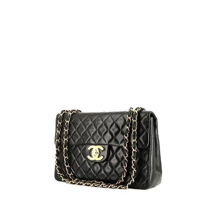 Lovely Chanel Timeless Maxi Jumbo shoulder bag in black quilted leather, hardware in gilt metal, one convertible chain strap in gilt metal interwoven with black leather allowing the bag to be worn in the hand or on the shoulder or accross the body.