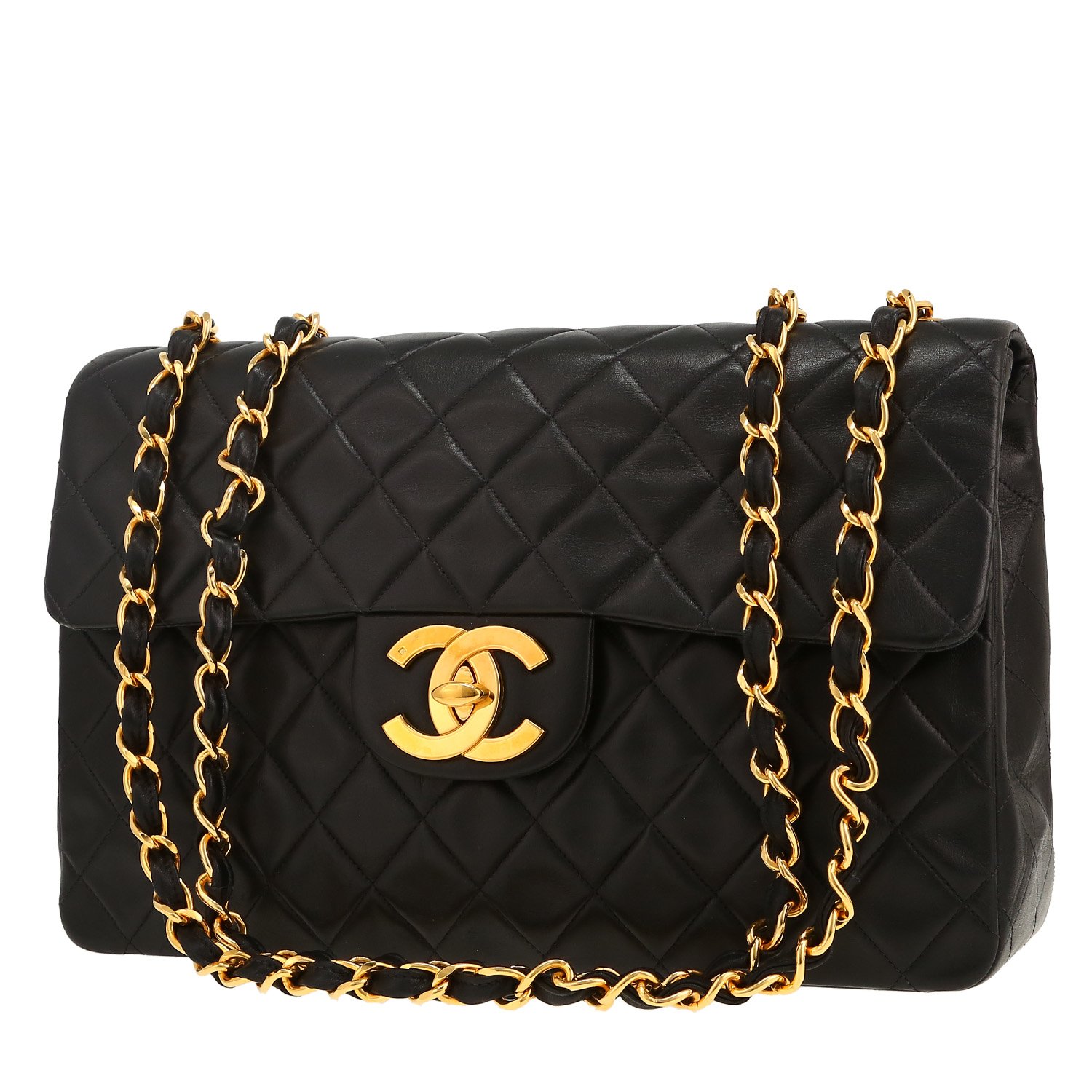 Lovely Chanel Timeless Maxi Jumbo shoulder bag in black quilted leather, hardware in gilt metal, one convertible chain strap in gilt metal interwoven with black leather allowing the bag to be worn in the hand or on the shoulder or accross the body.