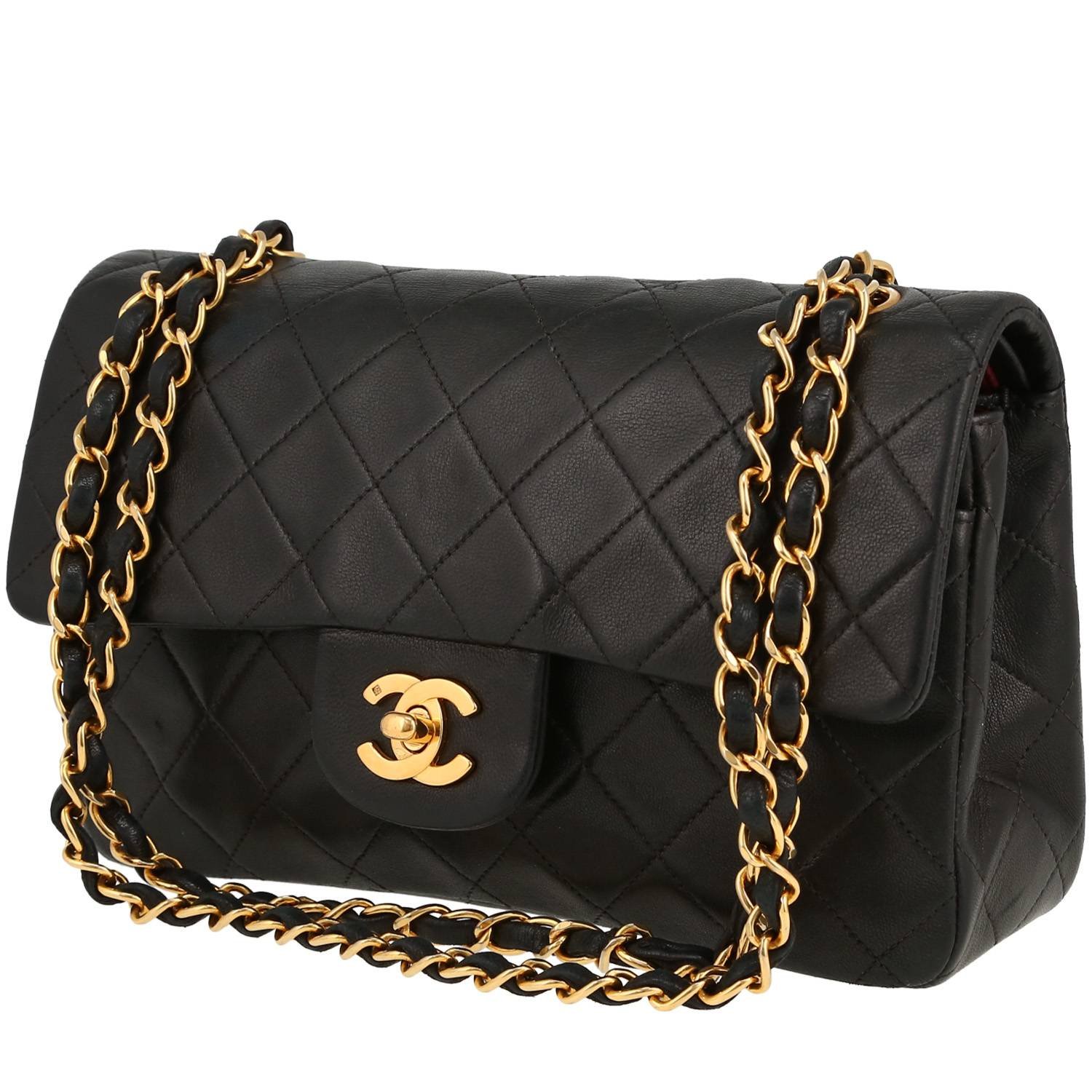 Elegant Chanel Timeless Petit handbag in black quilted leather, hardware in gilt metal, one chain strap in gilt metal interwoven with black leather allowing the bag to be worn in the hand or on the shoulder.
