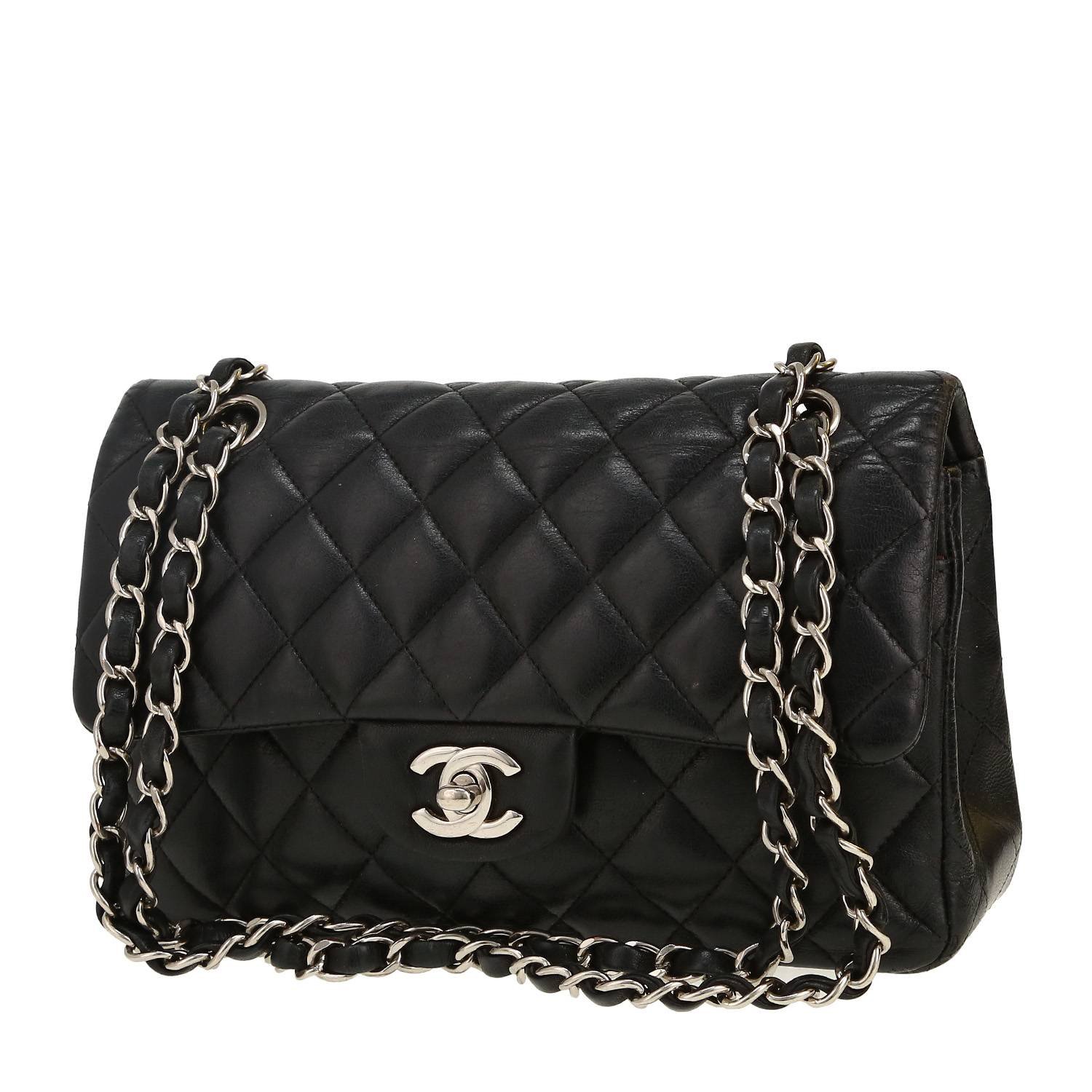 Lovely Chanel Timeless Petit handbag in black quilted leather, hardware in silver metal, one convertible chain strap in silver metal interwoven with black leather allowing the bag to be worn in the hand or on the shoulder.