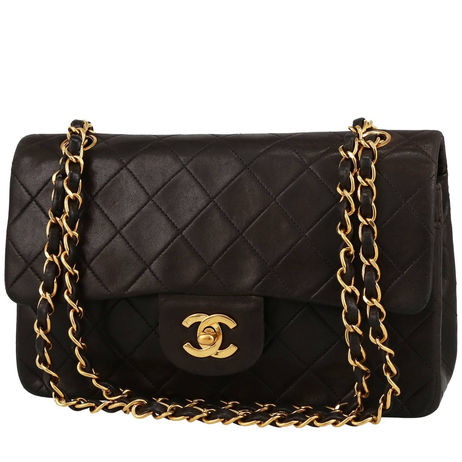 Lovely Chanel Timeless Petit handbag in brown quilted leather, hardware in gilt metal, one convertible chain strap in gilt metal interwoven with brown leather allowing the bag to be worn in the hand or on the shoulder.