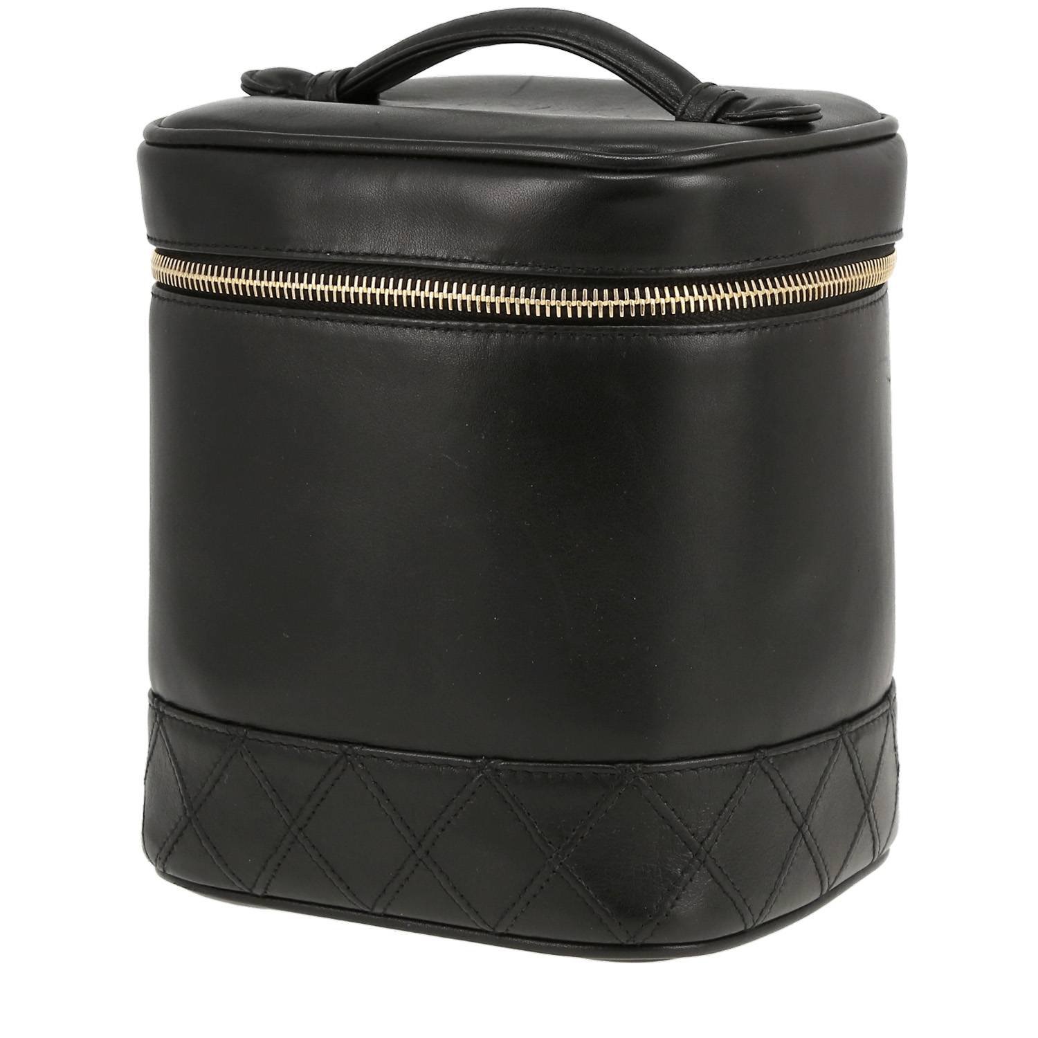 Practical Chanel vanity case in black leather, hardware in gilt metal, top handle in black leather allowing the bag to be worn in the hand.