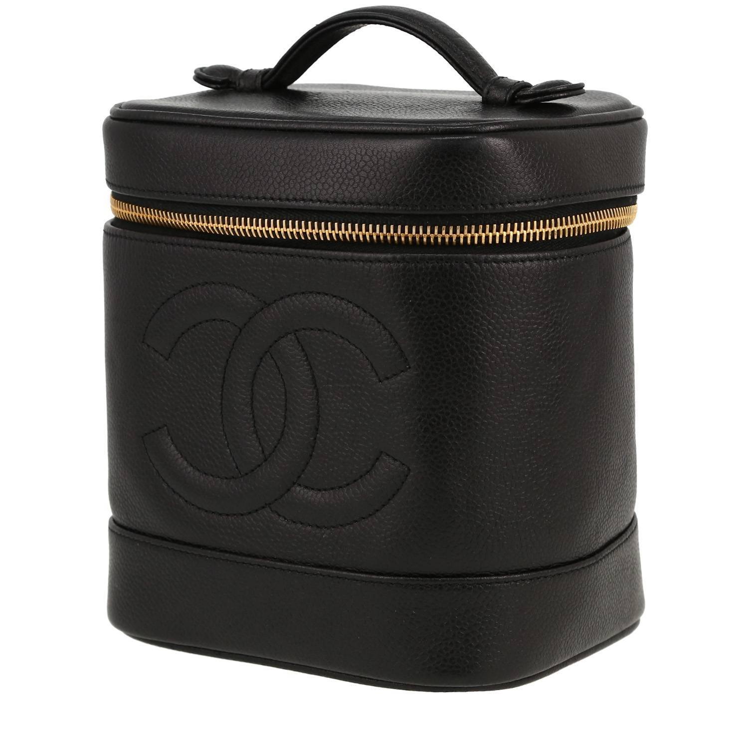 Very nice Chanel vanity case in black leather, hardware in gilt metal, top handle in black leather allowing the bag to be worn in the hand.