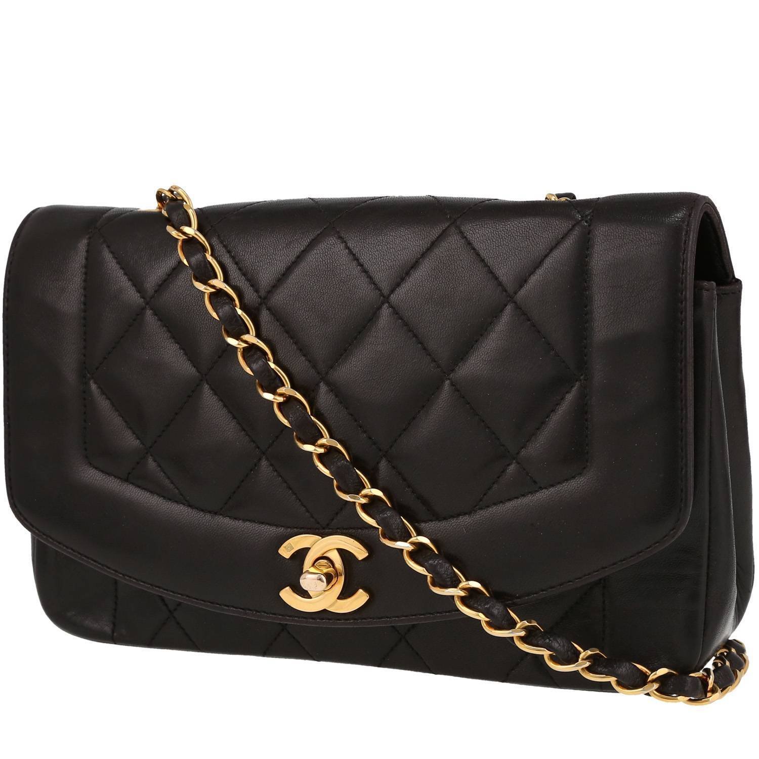 Magnificent Chanel Vintage Diana shoulder bag in black quilted leather, hardware in gilt metal, chain strap in gilt metal interwoven with black leather allowing the bag to be worn on the shoulder or accross the body.
