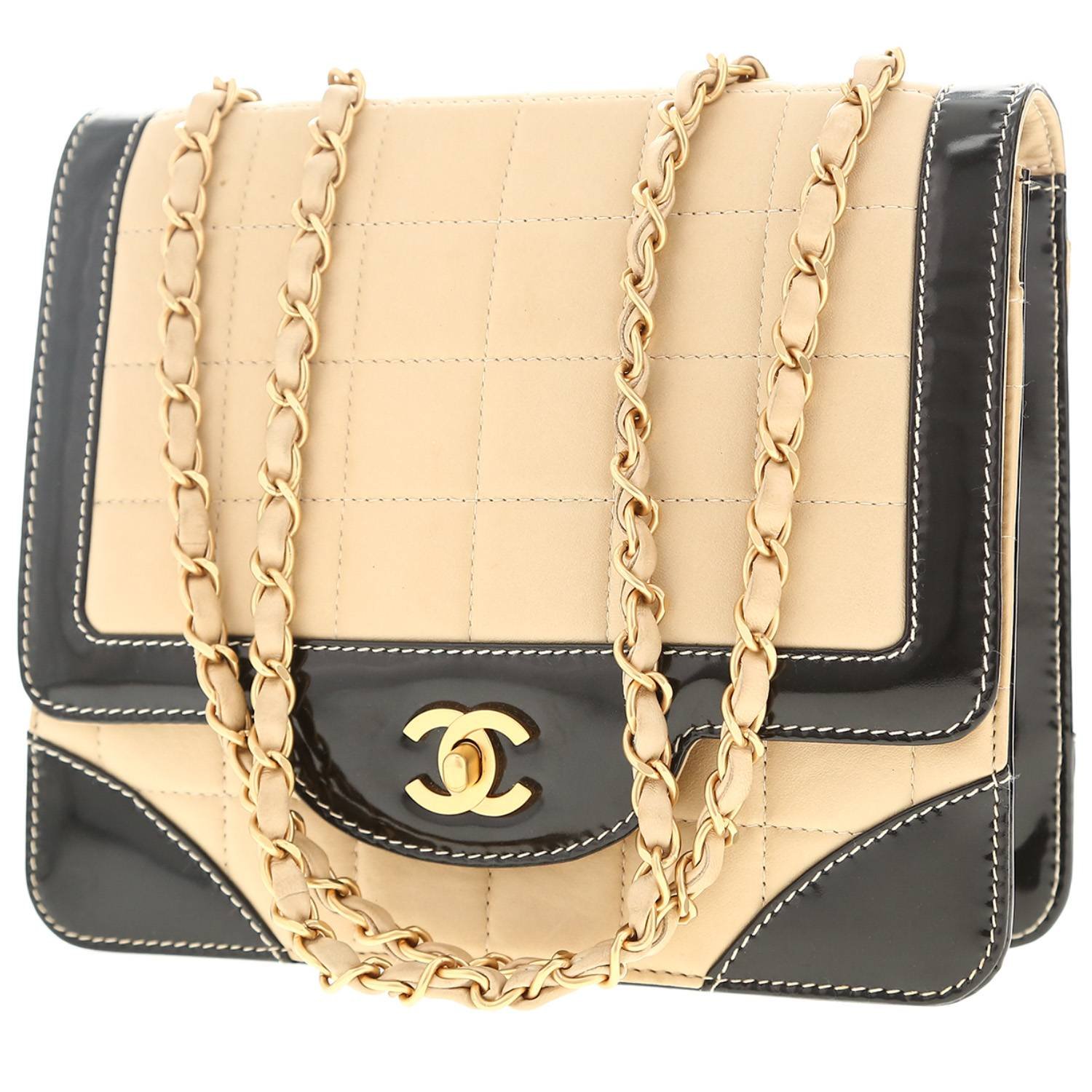 Elegant Chanel Vintage handbag in beige quilted leather, hardware in gilt metal, chain strap in gilt metal interwoven with beige leather allowing the bag to be worn in the hand or on the shoulder.