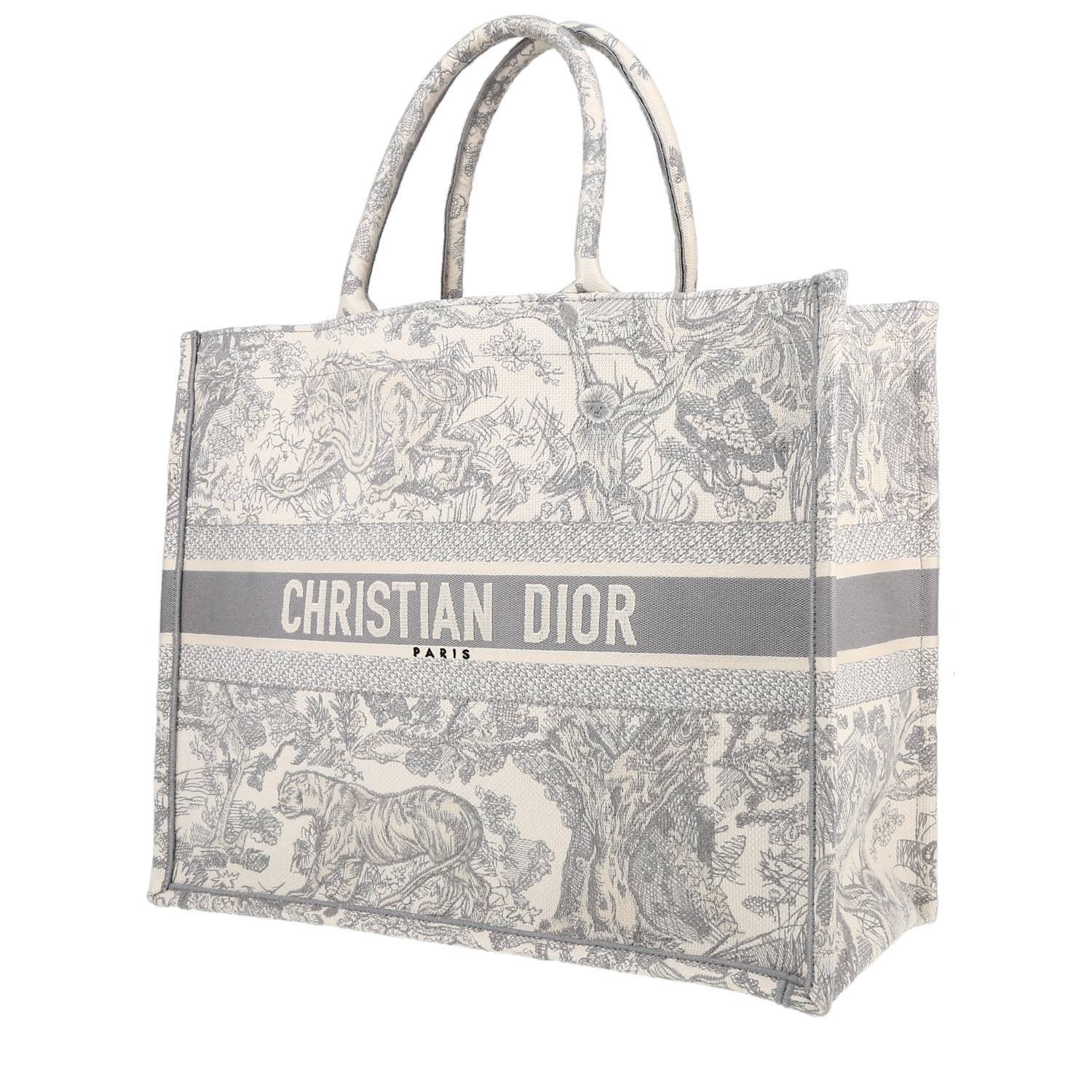 Dior Book Tote shopping bag in grey and ecru canvas of jouy