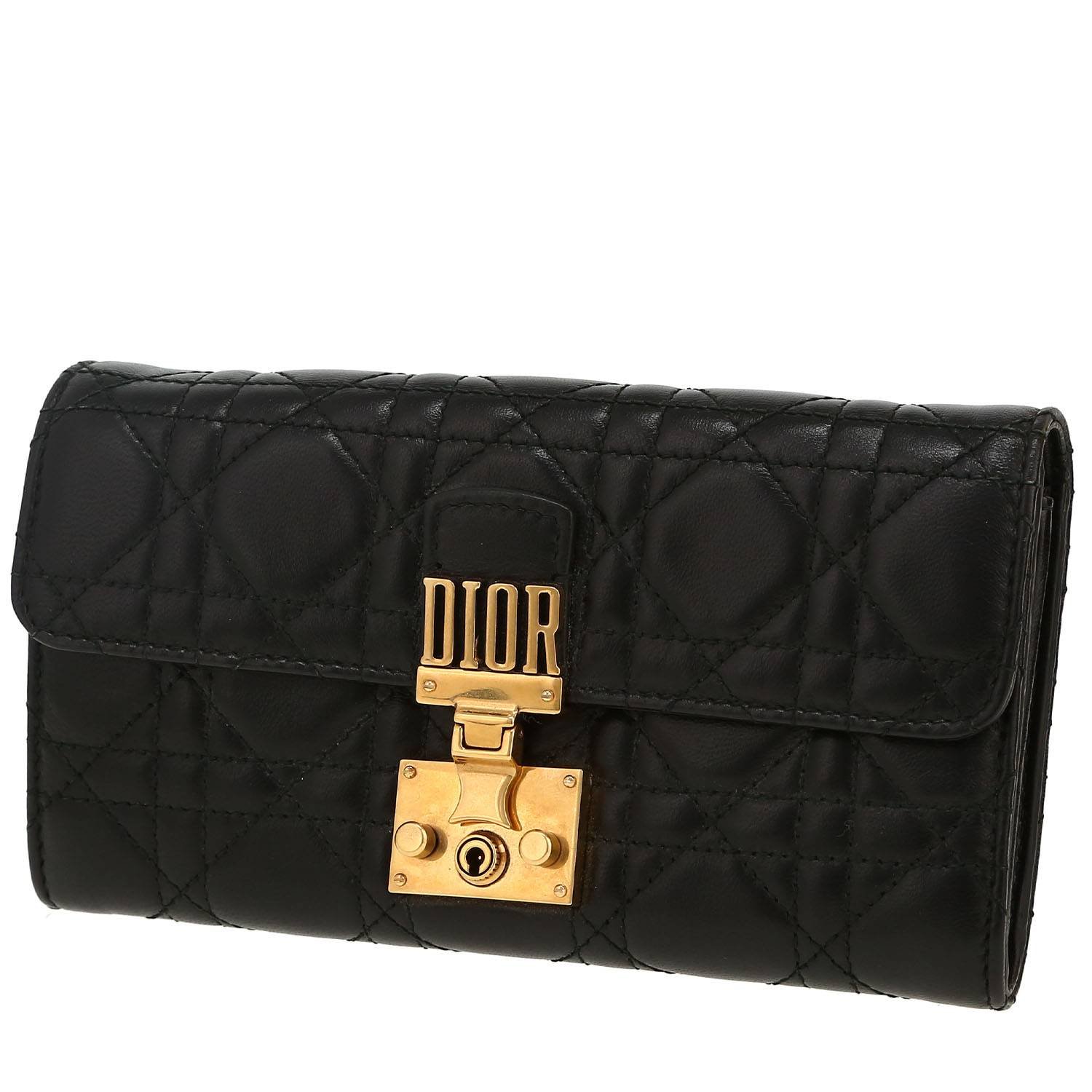 Charming Dior Dioraddict wallet in black leather cannage, hardware in gilt metal allowing the bag to be worn in the hand.