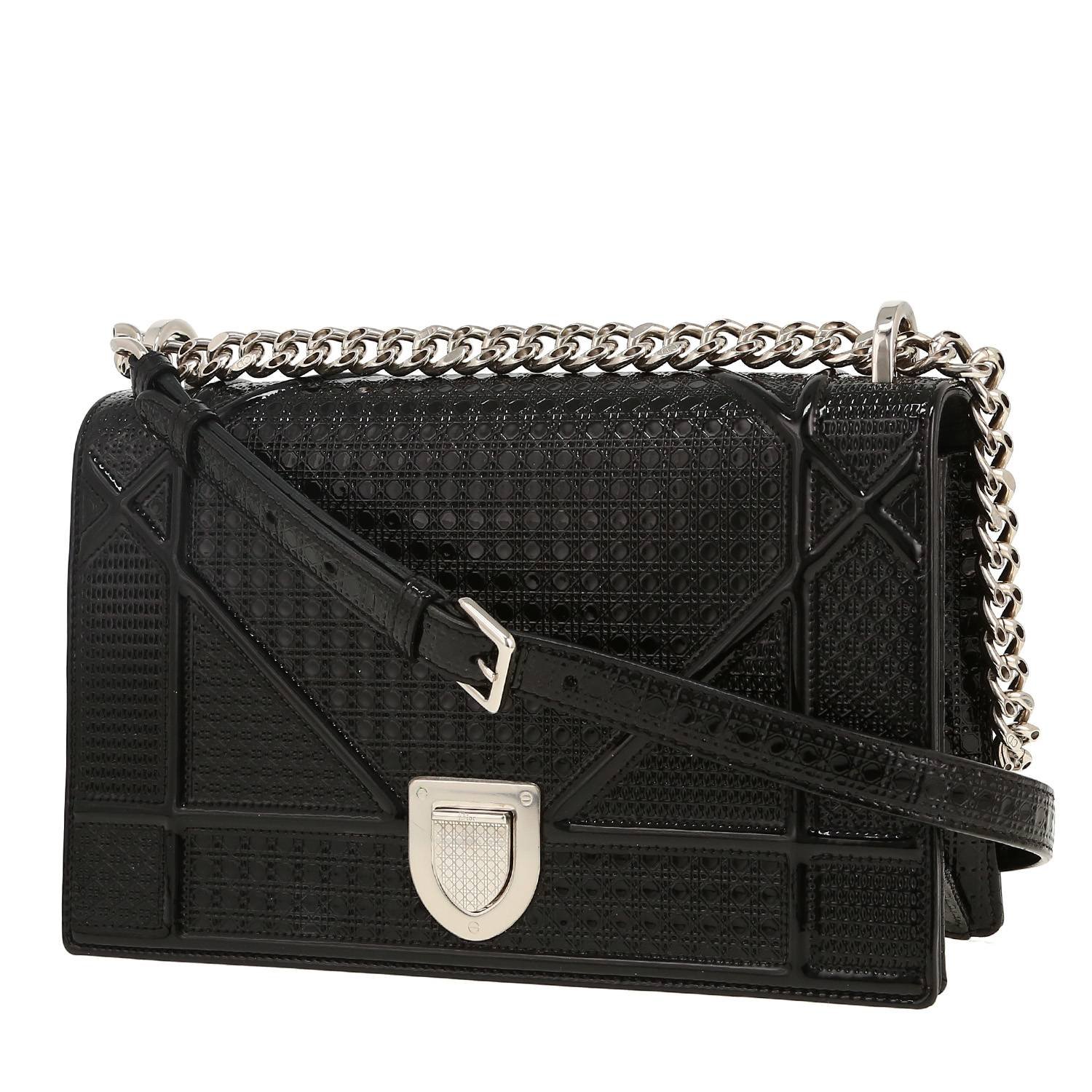 Elegant Dior Diorama handbag in black patent leather, hardware in silver metal, one convertible chain strap in silver metal allowing the bag to be worn in the hand or on the shoulder or accross the body.