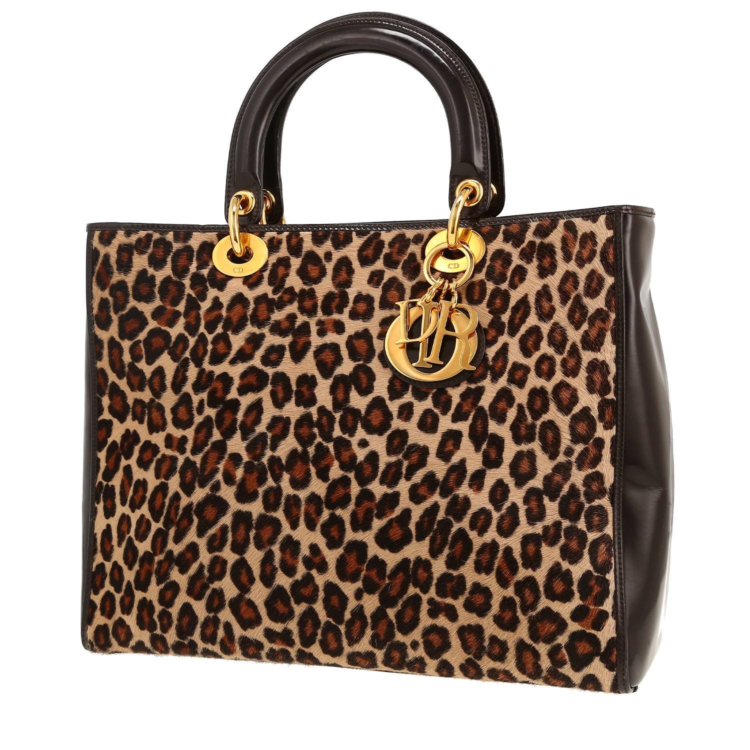 Funny Dior Lady Dior handbag in brown and beige foal, hardware in gilt metal, double handle in brown patent leather allowing the bag to be worn in the hand.
