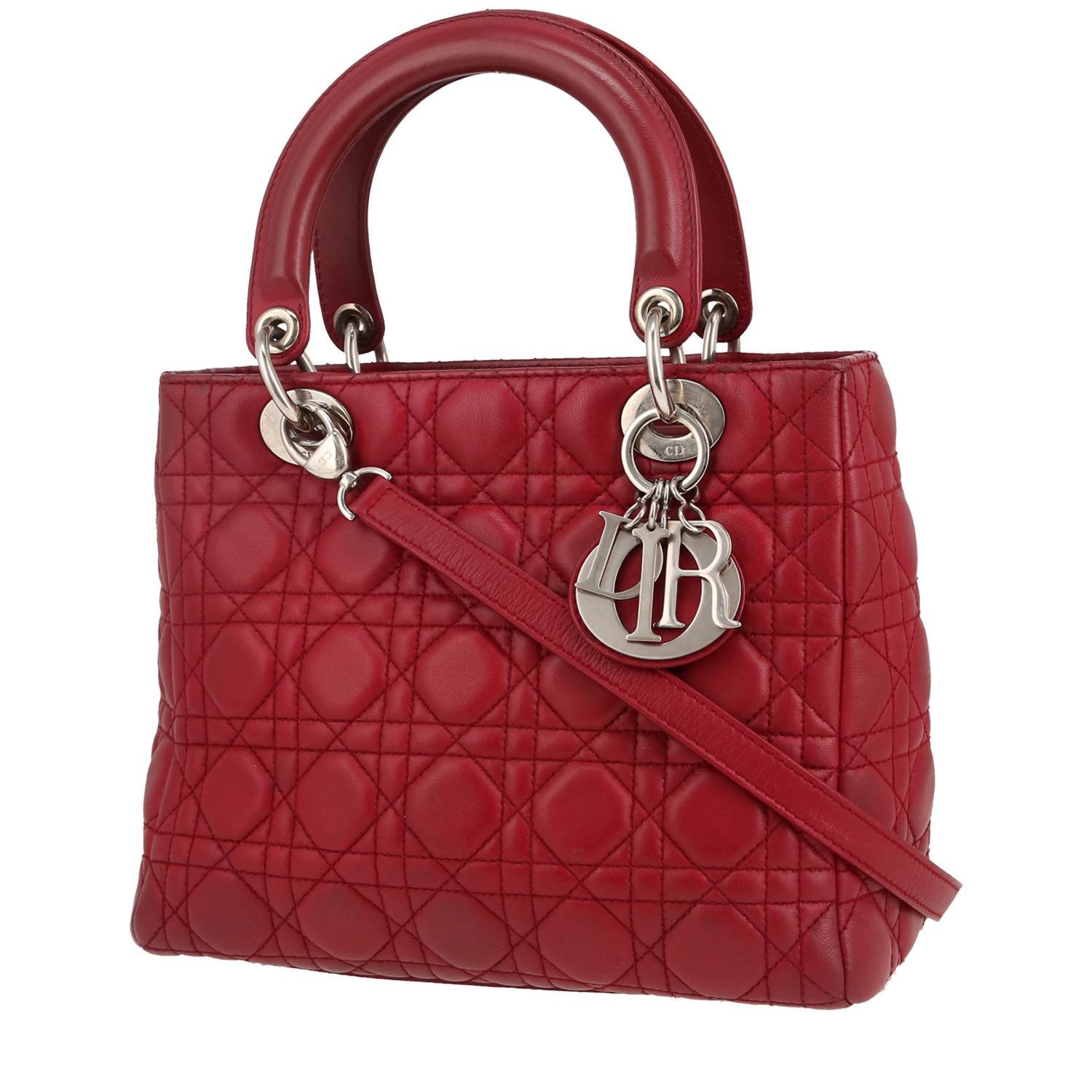 Unavoidable medium model Dior Lady Dior handbag in red leather cannage, hardware in silver metal, double handle in red leather allowing the bag to be worn in the hand or on the shoulder or accross the body.