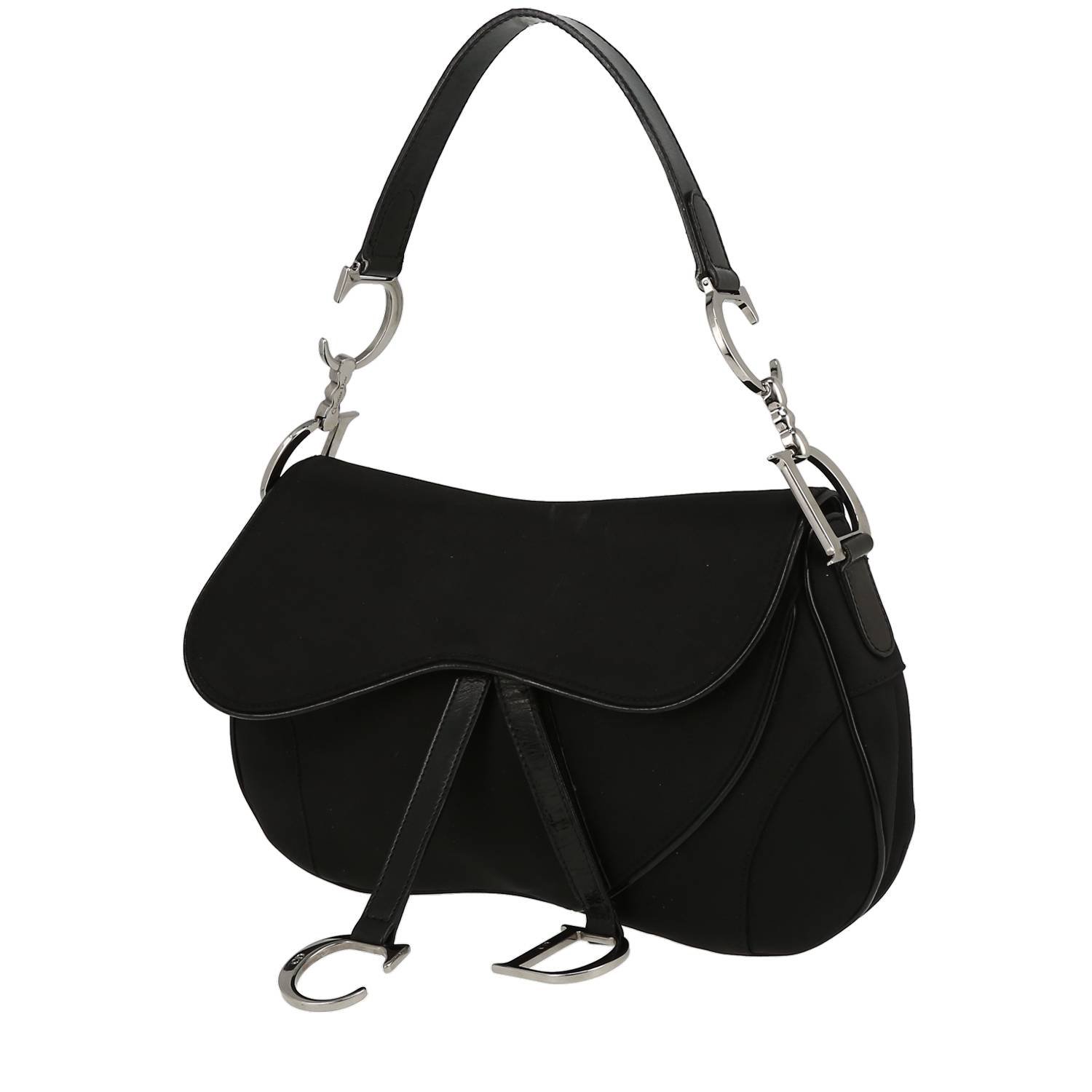 Chic Dior Saddle handbag in black canvas, hardware in silver metal, strap in black patent leather allowing the bag to be worn in the hand or on the shoulder.