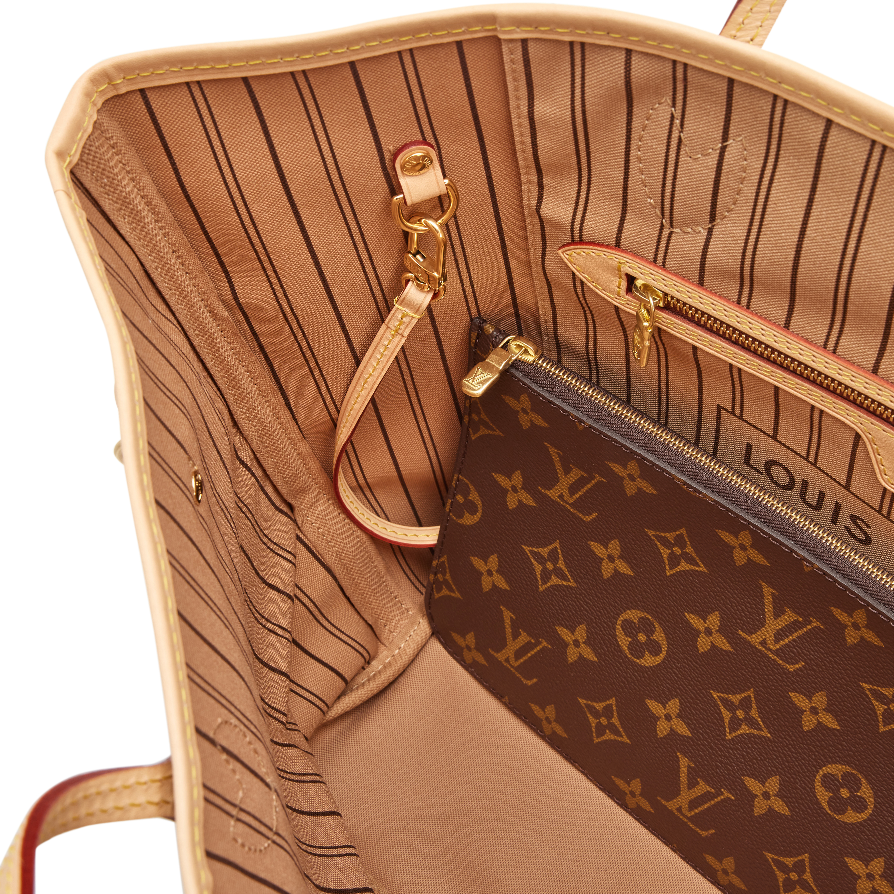 Louis Vuitton Ebene Brown Monogram Coated Canvas Neverfull MM Gold Hardware, 2023The interior is lined in a beige striped textile materialIncludes pochette and dust bagThis item is final sale and not eligible for return