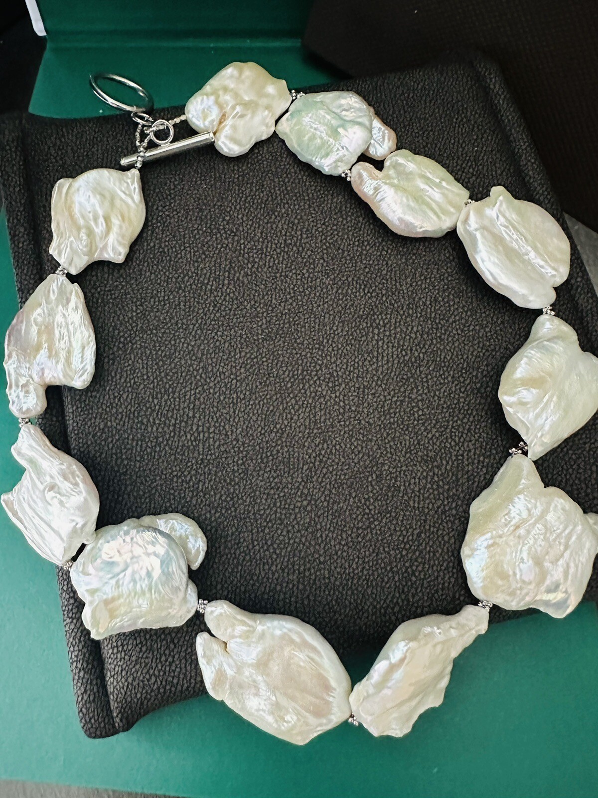 This beautiful estate ladies necklace is a stunning addition to any jewelry collection. Crafted from 14k white gold, the choker is adorned with a huge baroque cultured pearls, necklace measuring 17 inches in length. The pearl’s white color gives it a beautiful and elegant look, perfect for any occasion. Weight is 86.3 grams. The clasp is hallmarked 14k gold. The pearls average between 25mm-33mm each in length. Stunning necklace !