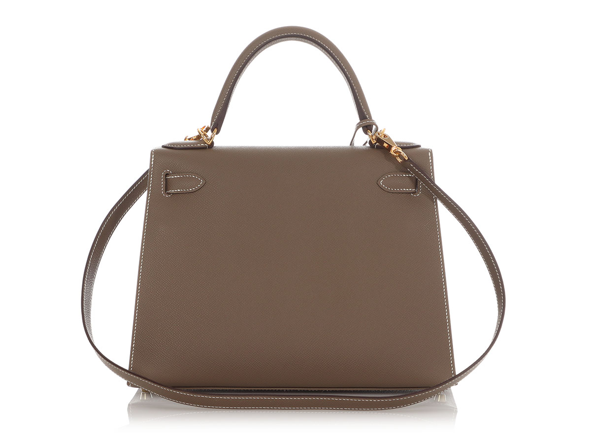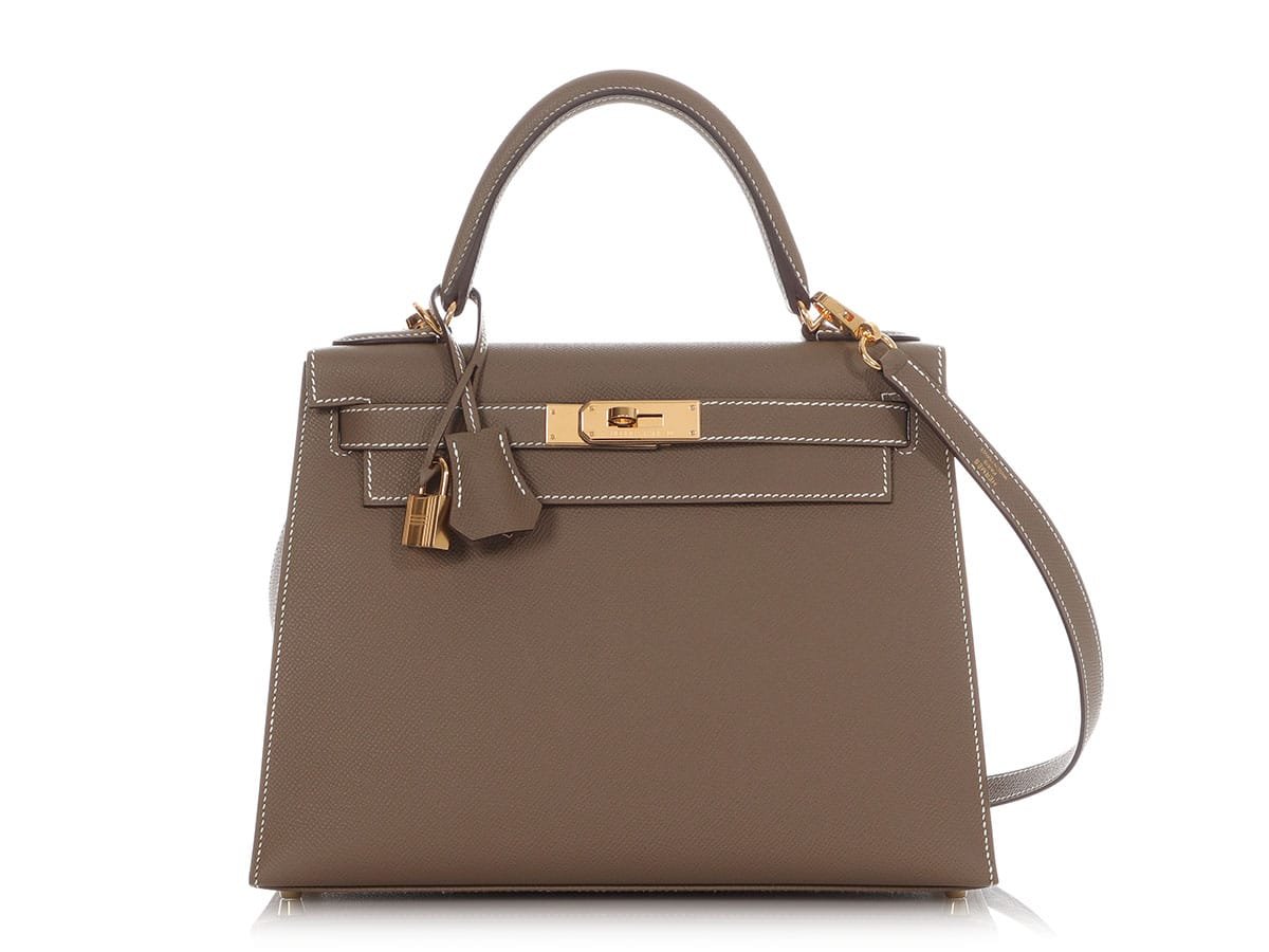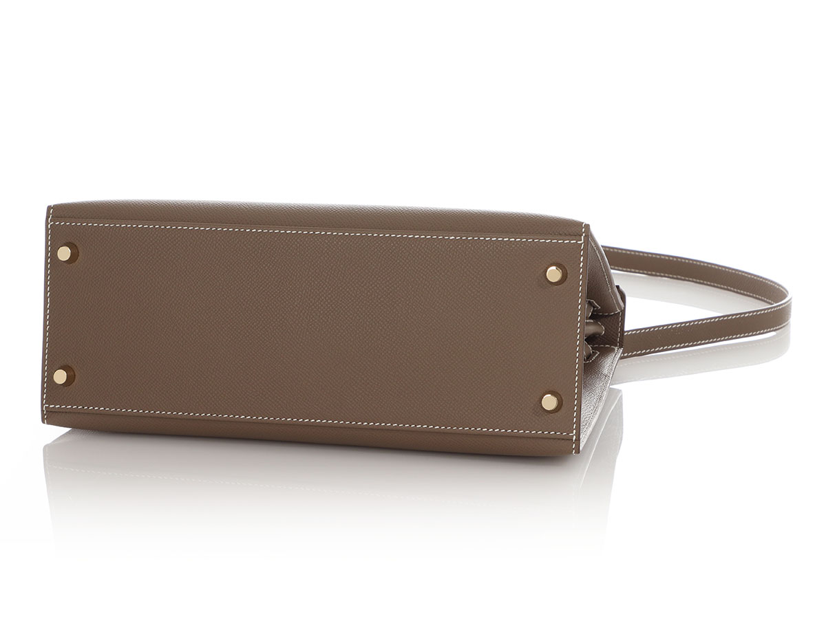 Hermès Kelly 28 Epsom Etoupe. Hermès Kelly 28 Sellier Epsom Etoupe Gold Hardeware. This elegant Kelly 28 bag in etoupe color is made of durable Epsom leather with gold hardware. A lock, two keys, the original strap, the original dustbag, the Hermès box and the original invoice from 2023 are included. It can also be worn beautifully as a crossbody. The Kelly bag from the house of Hermès is considered an absolute icon among handbags and has stood for elegance and class for decades. The Kelly 28 Sellier Epsom bag is brand new, never worn and has stamp B.