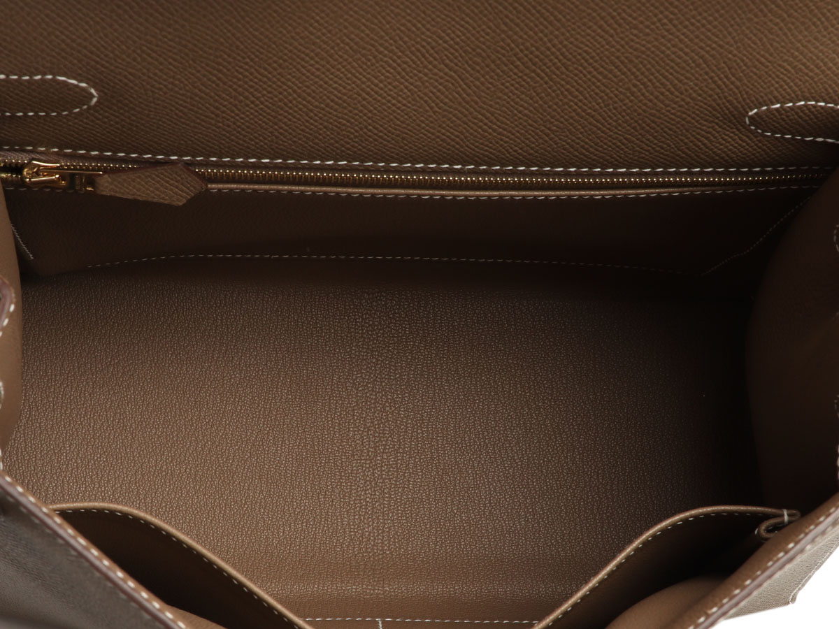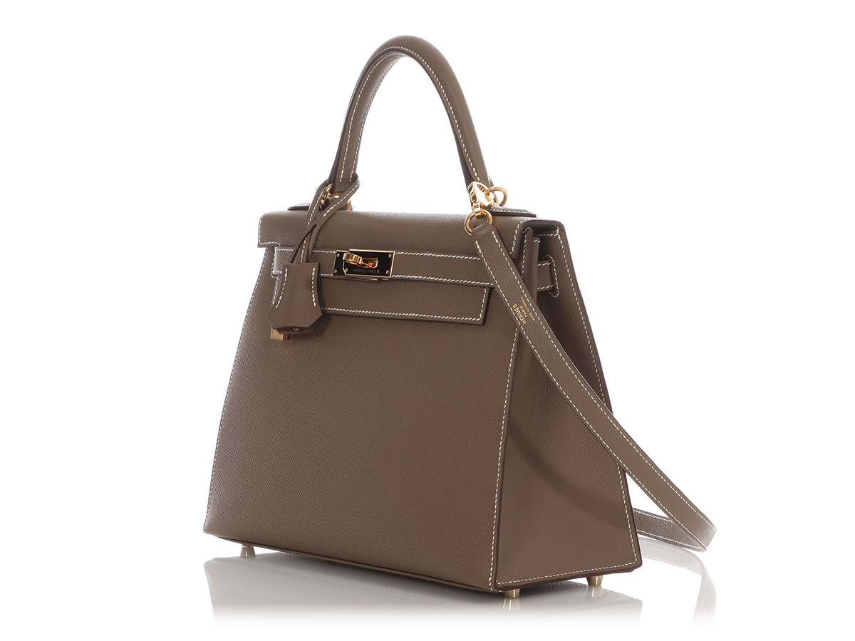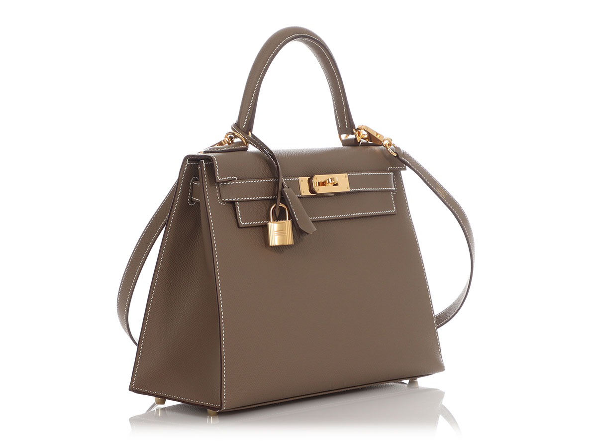 Hermès Kelly 28 Epsom Etoupe. Hermès Kelly 28 Sellier Epsom Etoupe Gold Hardeware. This elegant Kelly 28 bag in etoupe color is made of durable Epsom leather with gold hardware. A lock, two keys, the original strap, the original dustbag, the Hermès box and the original invoice from 2023 are included. It can also be worn beautifully as a crossbody. The Kelly bag from the house of Hermès is considered an absolute icon among handbags and has stood for elegance and class for decades. The Kelly 28 Sellier Epsom bag is brand new, never worn and has stamp B.