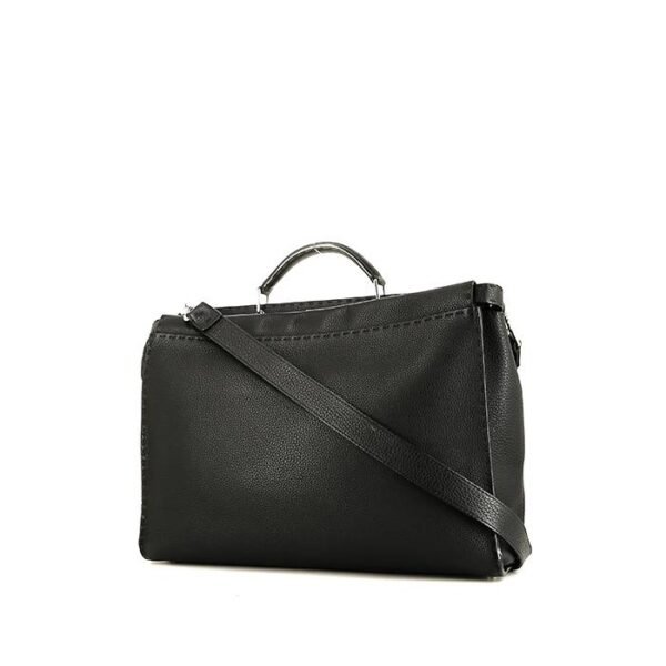 Elegant large model Fendi Peekaboo handbag in black leather, hardware in silver metal, top handle in black leather, black leather adjustable and removable strap to be worn accross the body allowing the bag to be worn in the hand or on the shoulder.