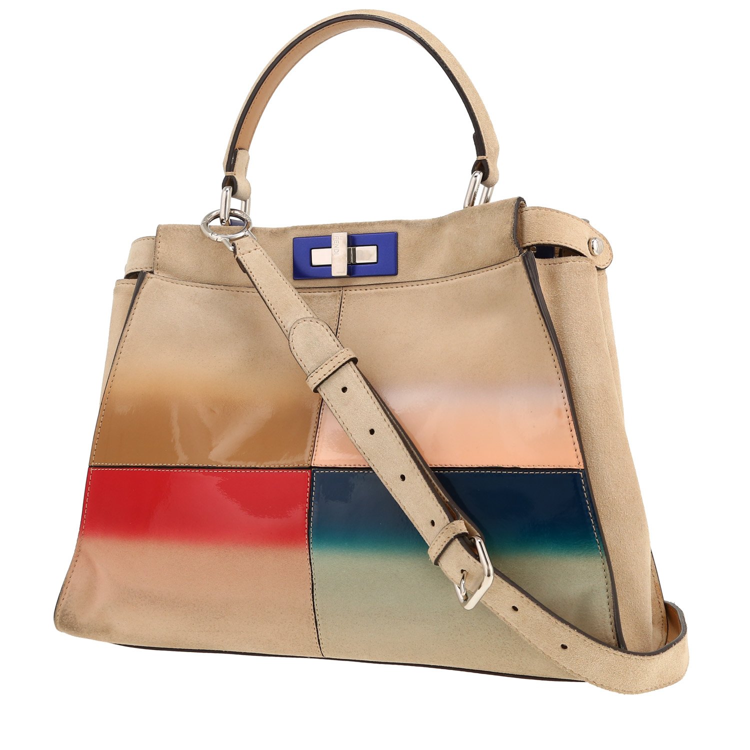 Charming medium model Fendi Peekaboo handbag in beige suede, hardware in silver metal, top handle in beige suede, beige leather removable strap to be worn accross the body allowing the bag to be worn in the hand or on the shoulder or accross the body.