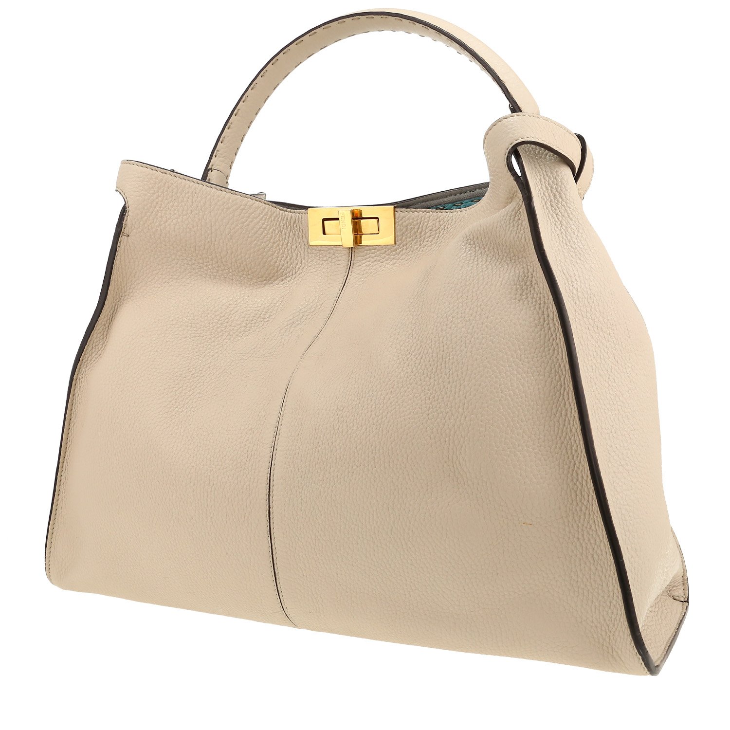 Charming Fendi X-lite handbag in beige grained leather, hardware in gilt metal, top handle in beige leather allowing the bag to be worn in the hand.