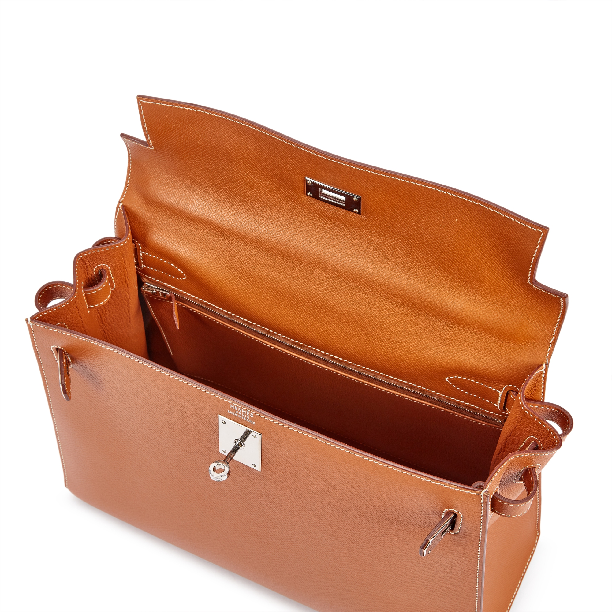 The interior is lined in Gold chevre and has one zip pocket with Hermès engraved pull and two open pockets on the opposite side.