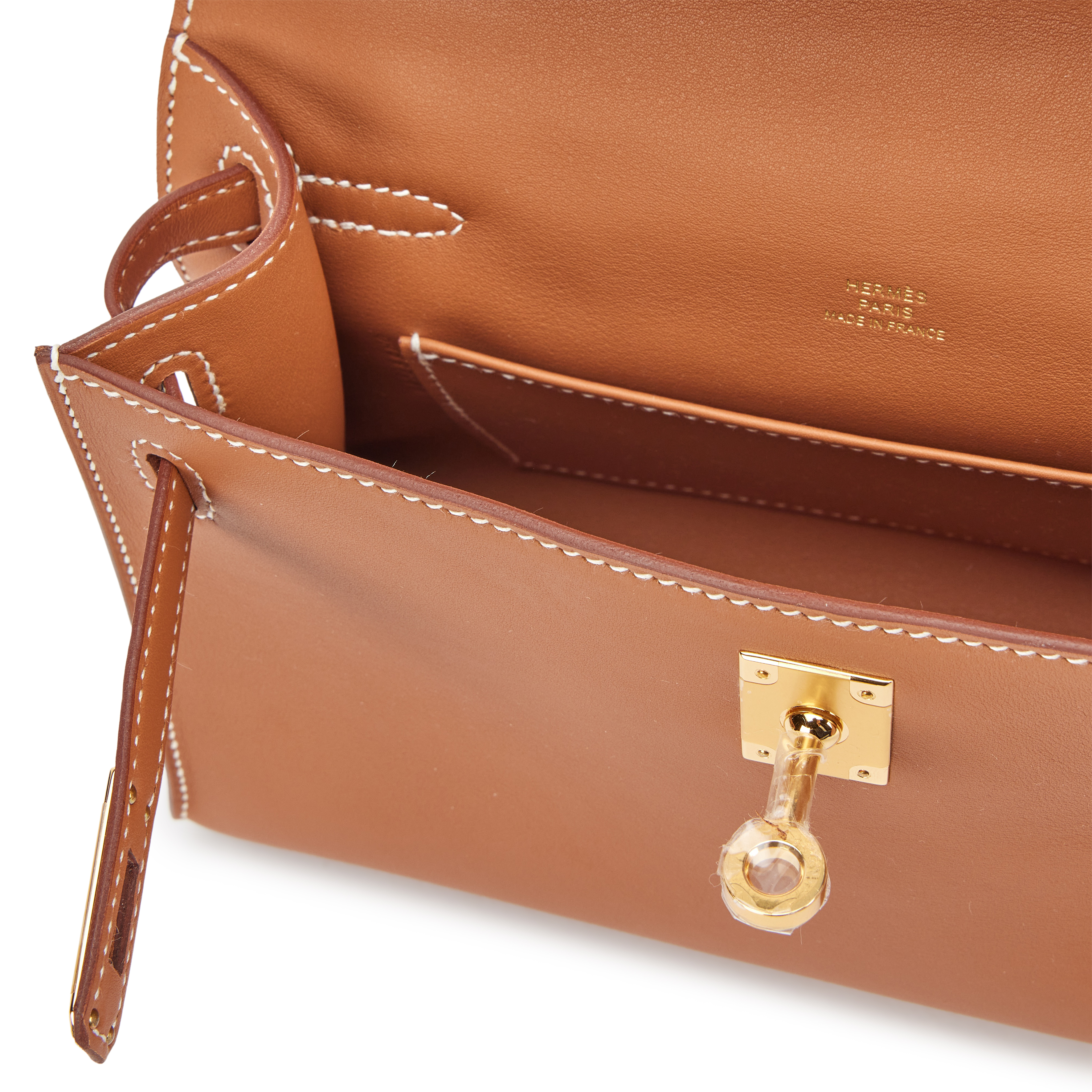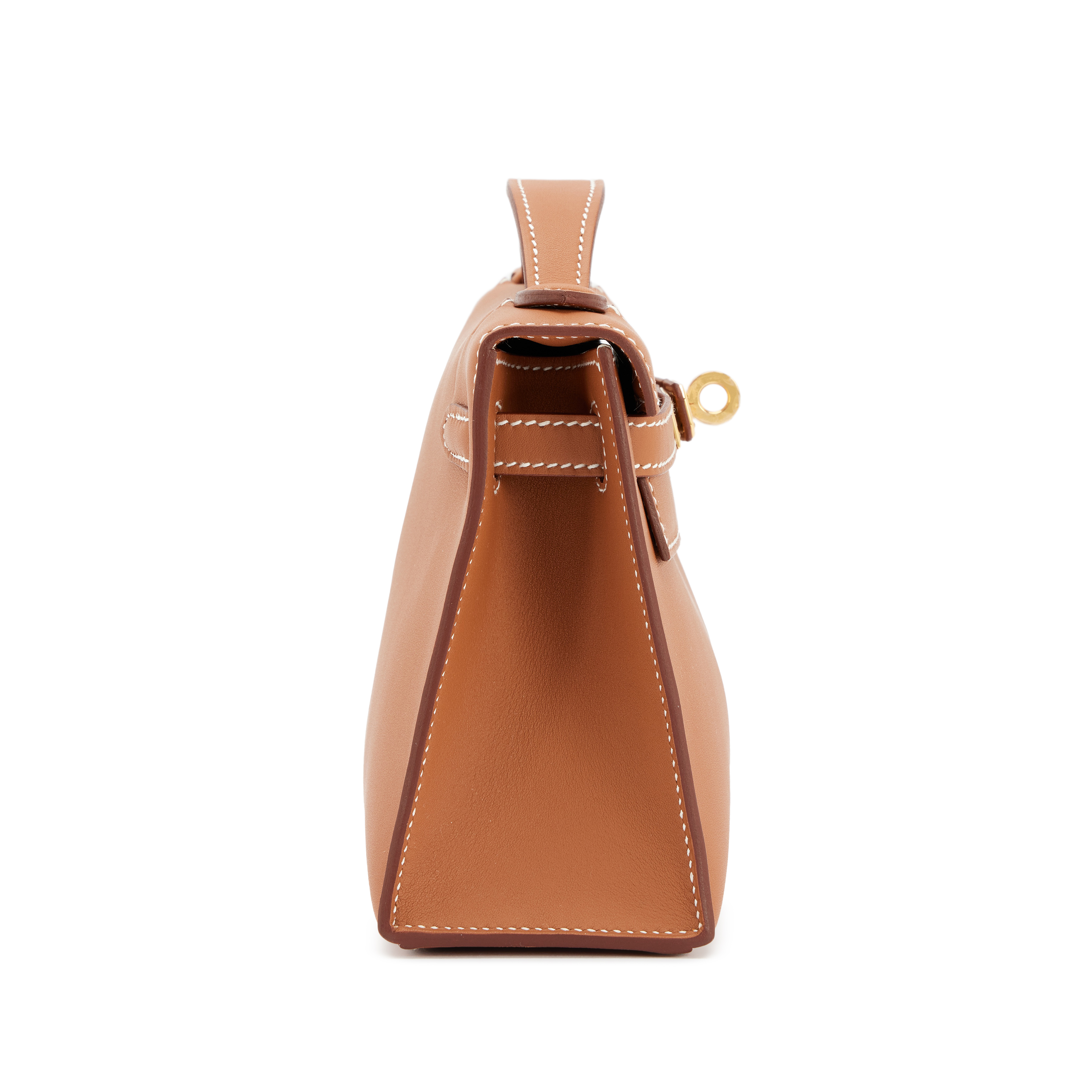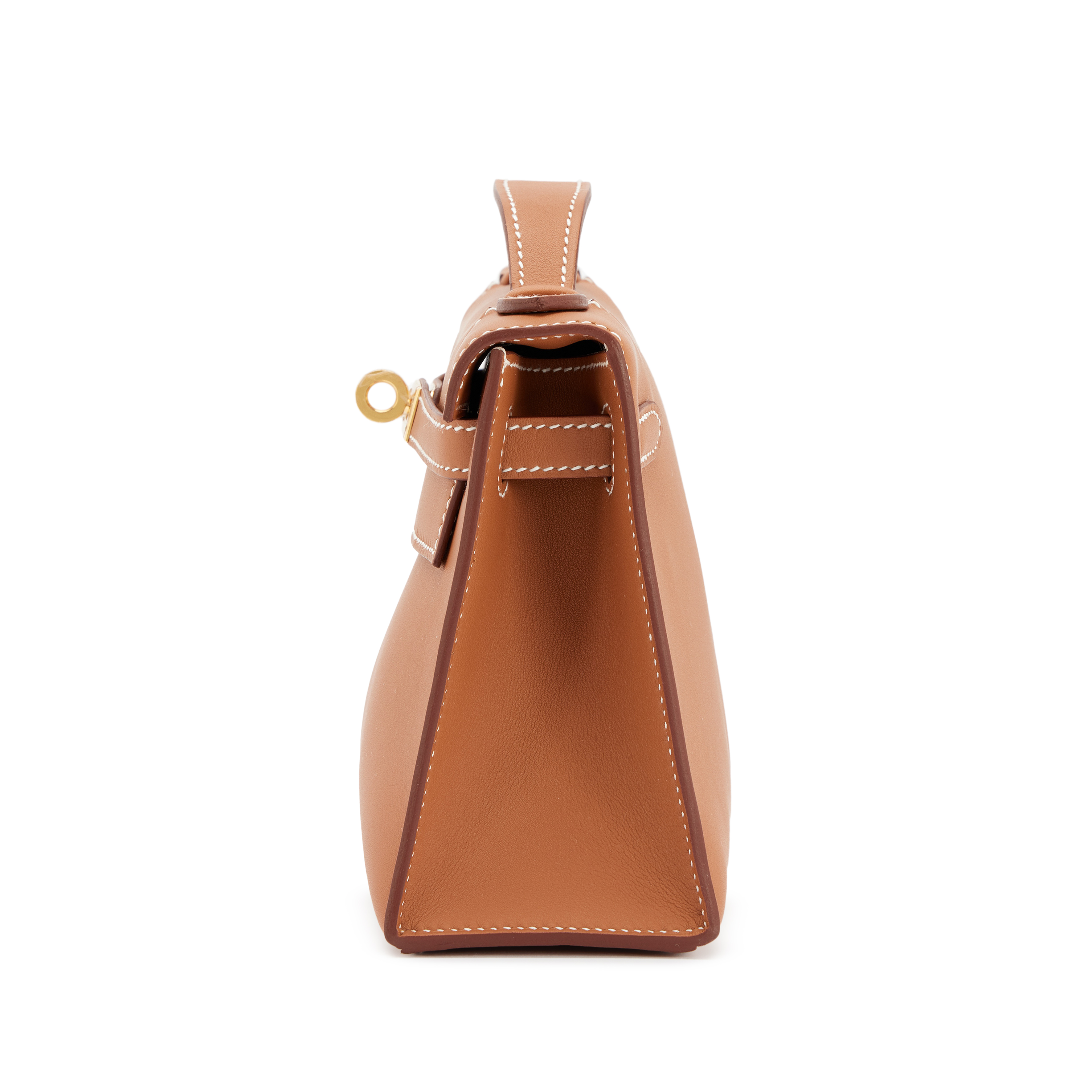 This Mini Kelly Pochette is in is in gold with with gold hardware, contrast stitching, front flap with two straps, toggle closure and single flat handle.