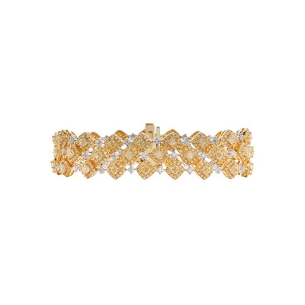 Composed of cushion cut yellow diamonds surrounded by round brilliant cut yellow diamonds and accented by round brilliant cut white diamonds.Cushion cut yellow diamonds weighing a total of approximately 9.15 caratsRound cut yellow diamonds weighing a total of approximately 5.10 caratsWhite diamonds weighing a total of approximately 2.00 carats18 karat yellow and white goldTotal weight 47.60 gramsLength 7 inches, width ¾ inch