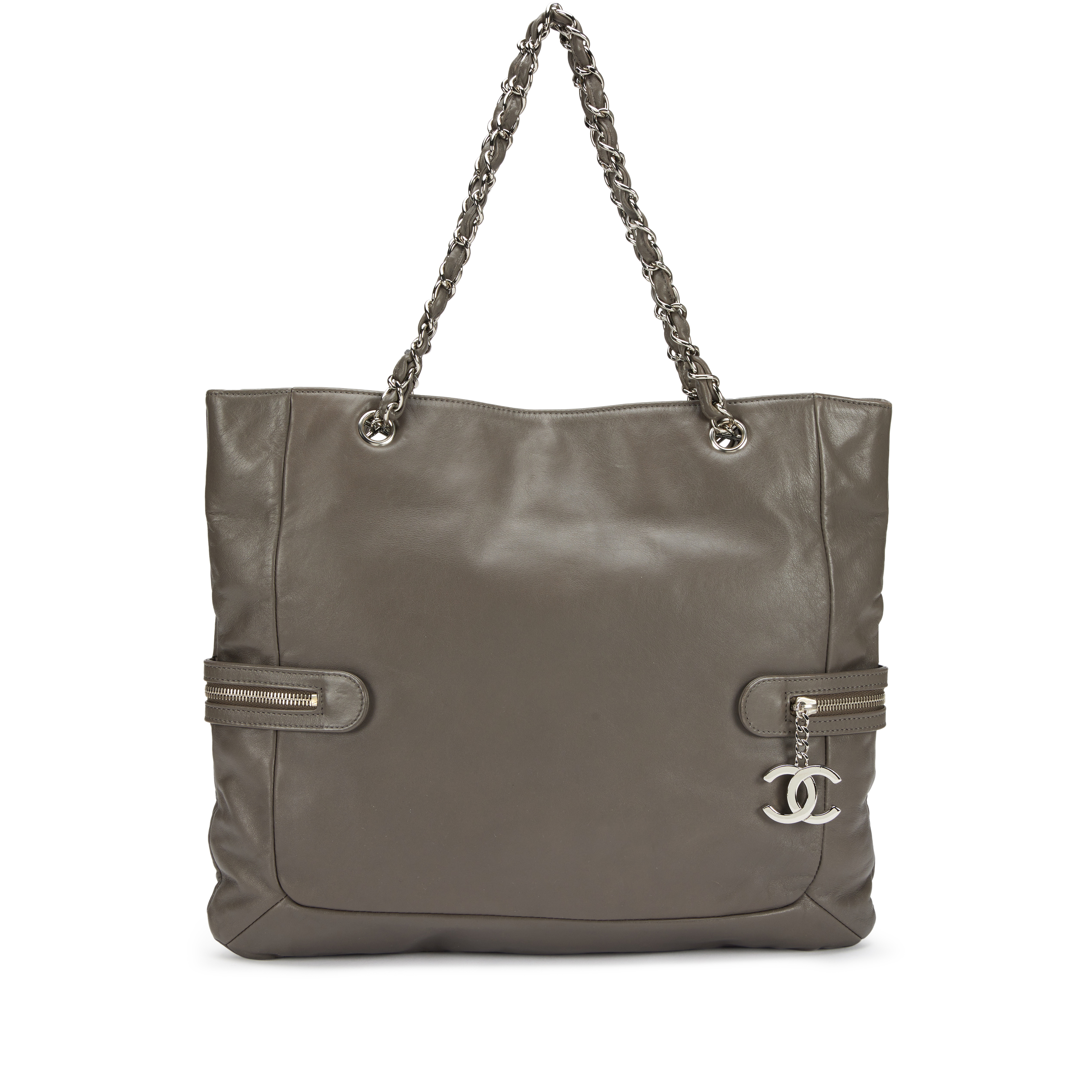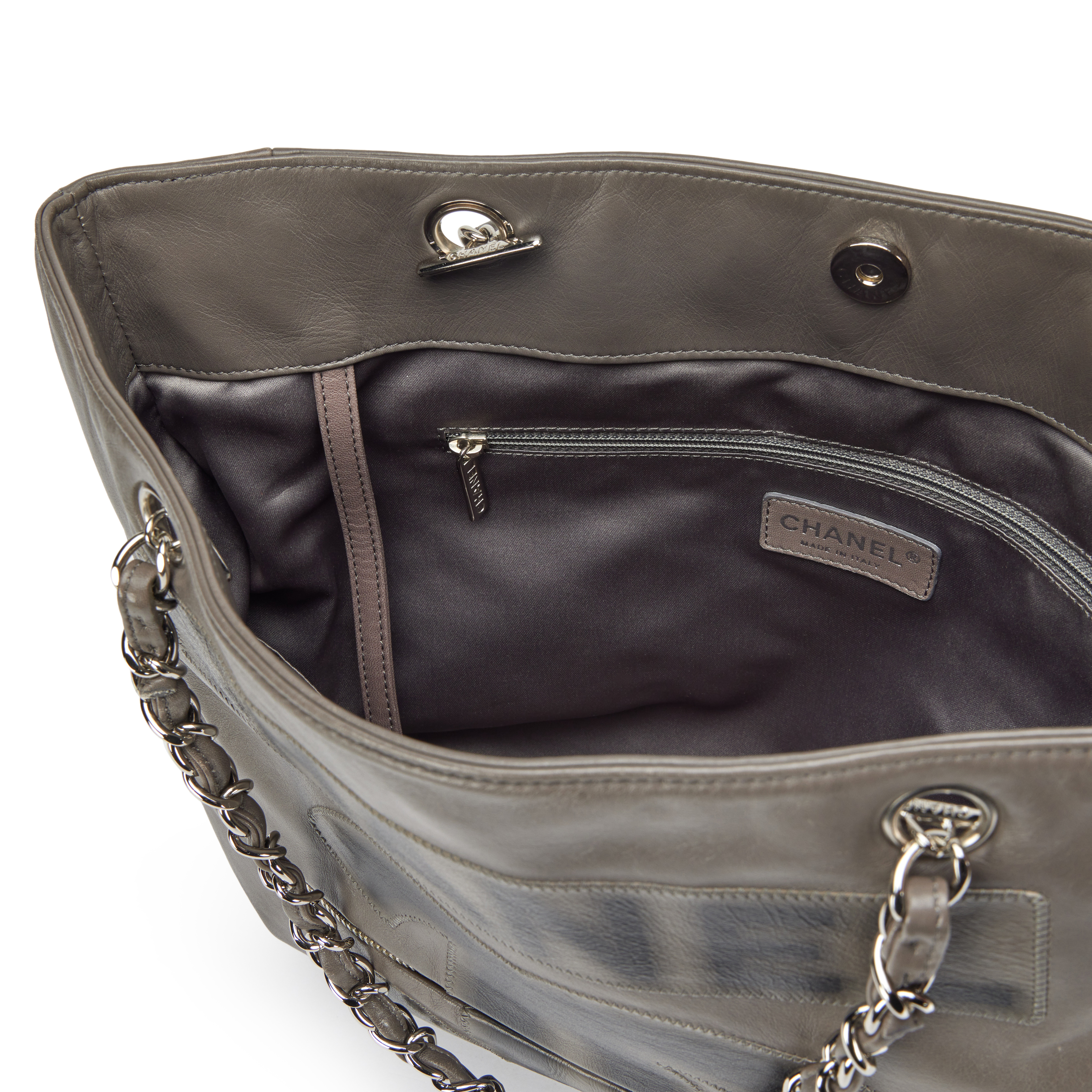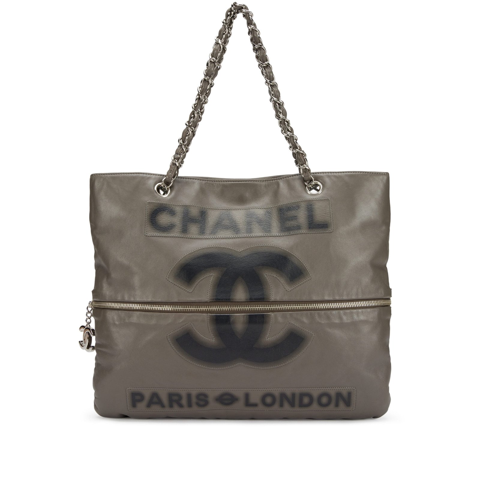 Chanel Grey Calfskin Large Expandable Paris London Tote Bag Silver Hardware, 2008The interior is lined in a grey leatherIncludes authenticity card and dust bagThis item is final sale and not eligible for return