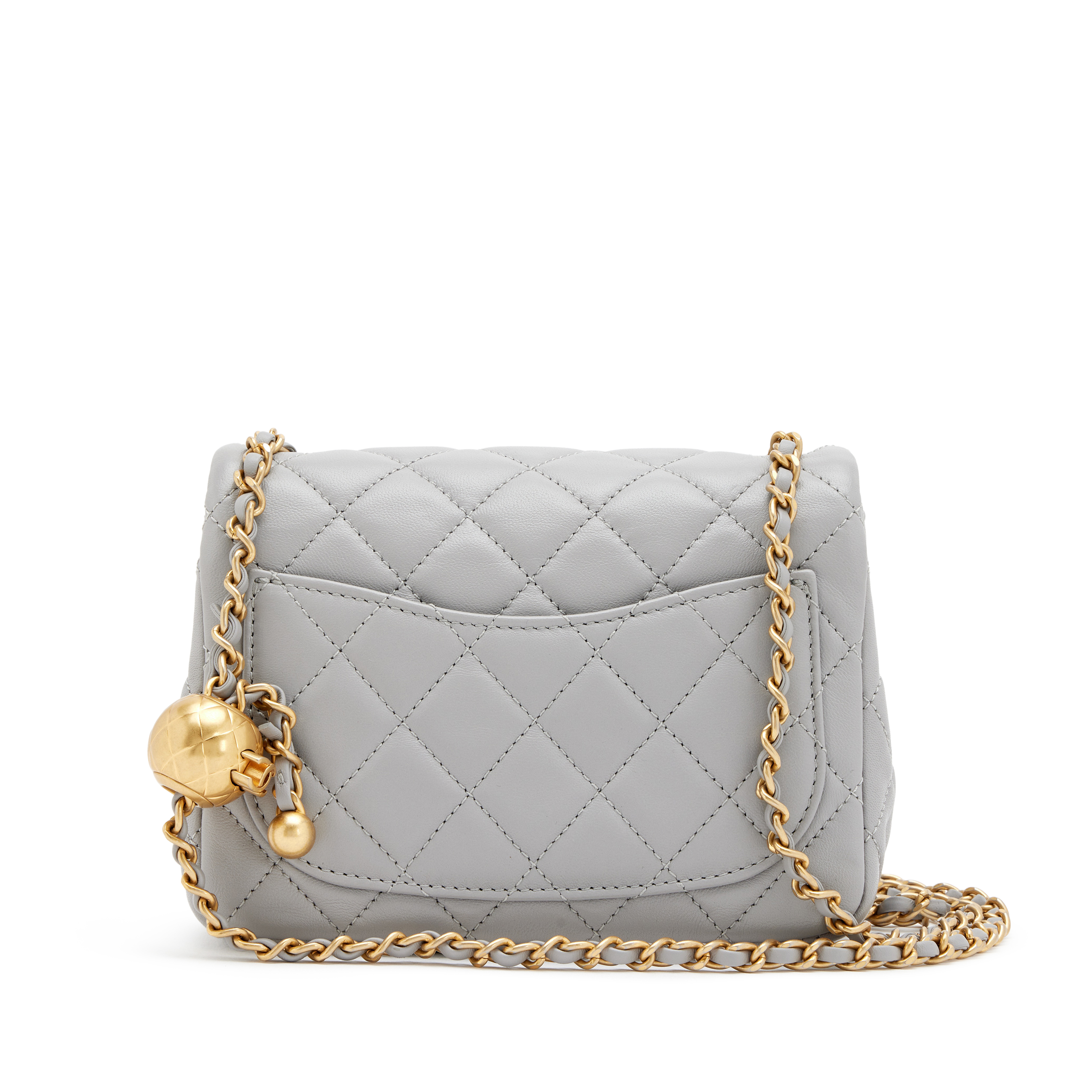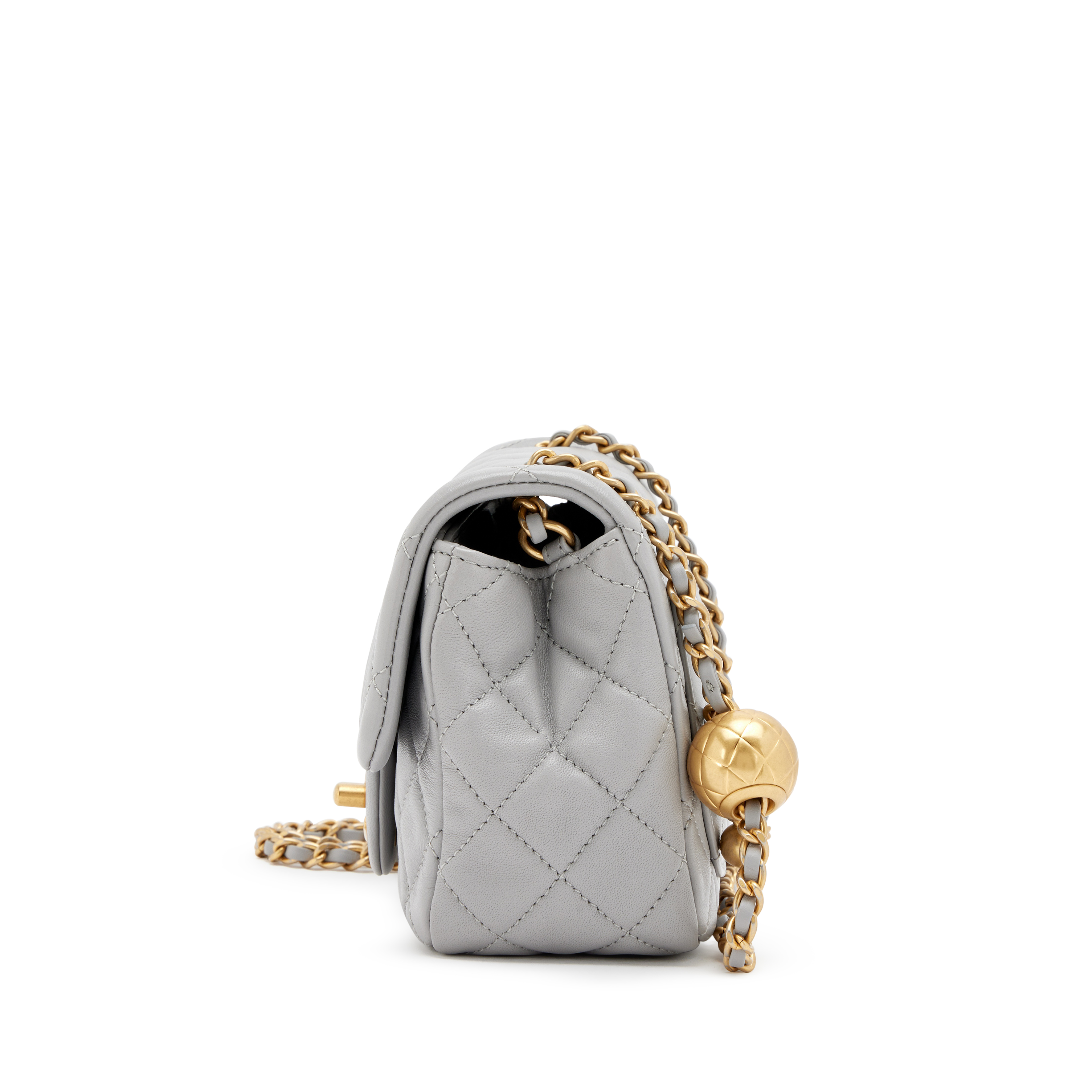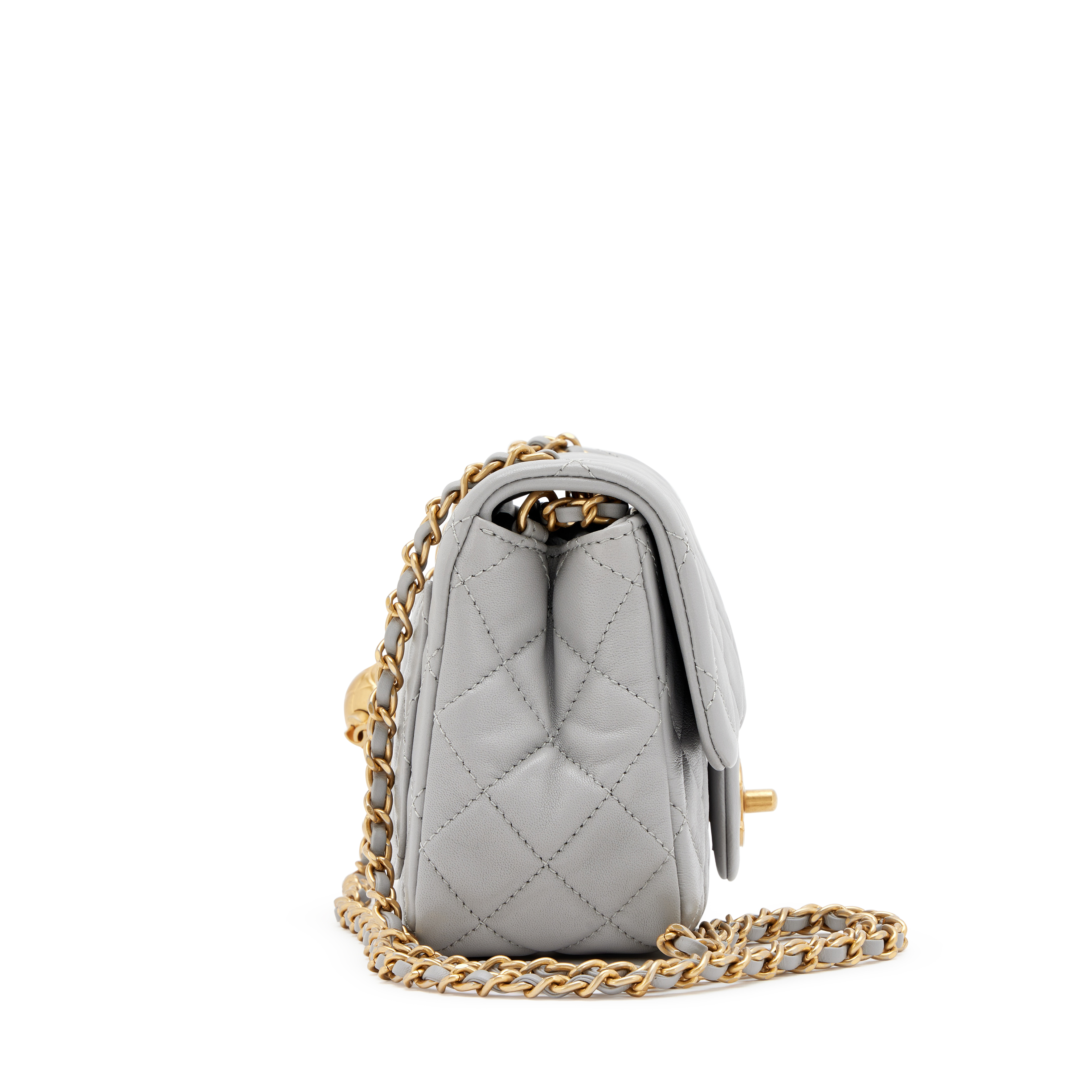 Chanel Grey Quilted Lambskin Pearl Crush Mini Flap Bag Aged Gold Hardware, 2021The interior is lined in a gold leatherIncludes information booklet, ribbon, felt protector, dust bag, and boxThis item is final sale and not eligible for return