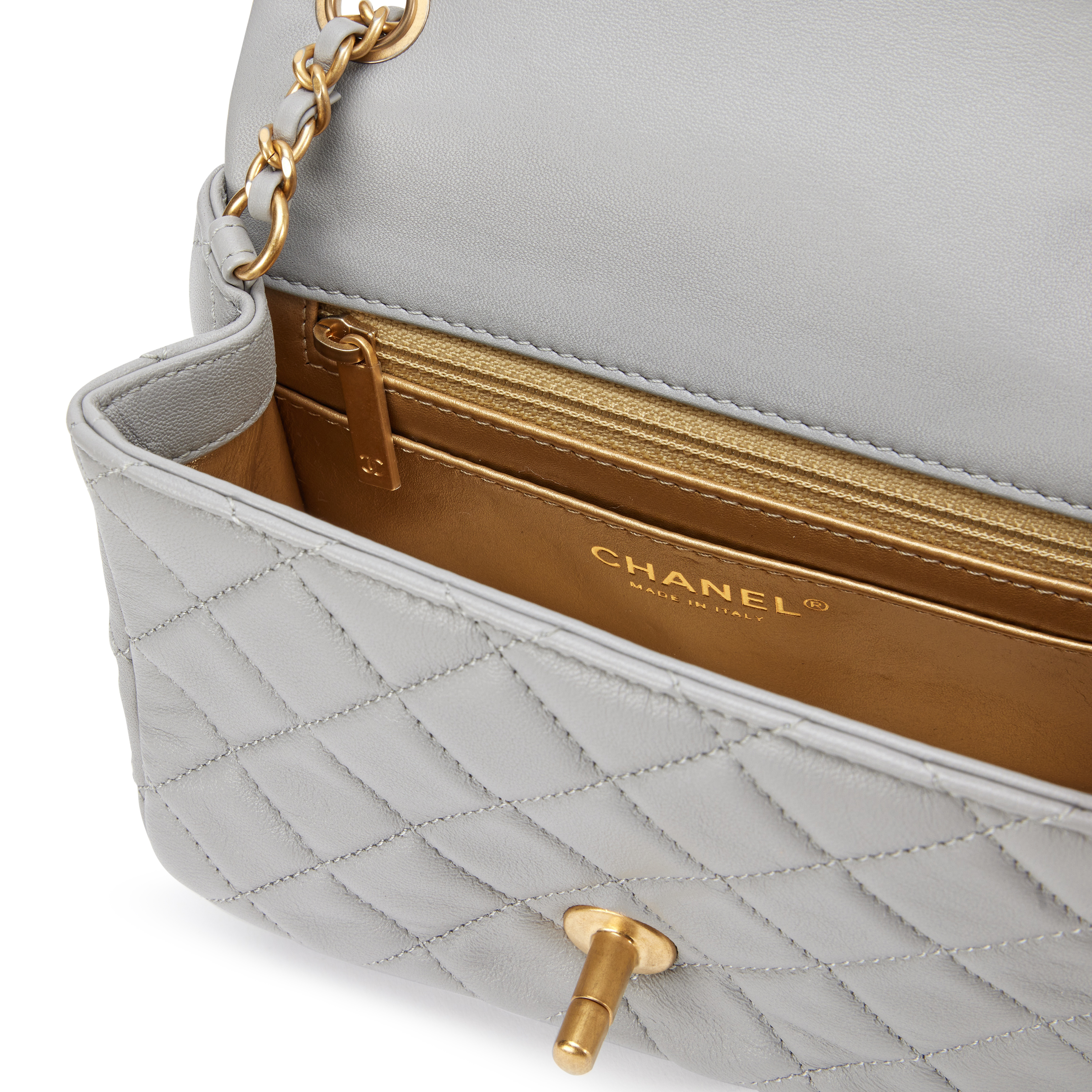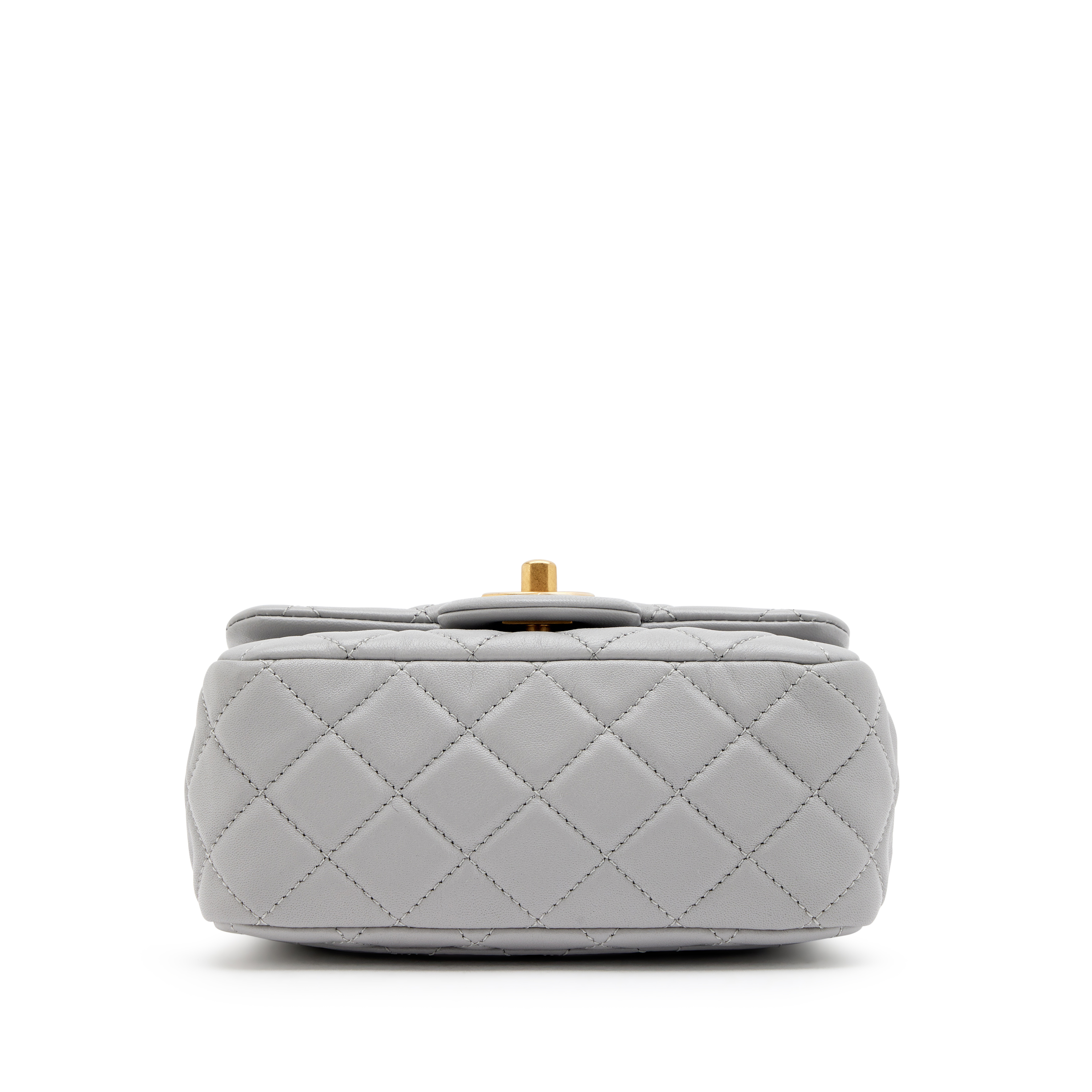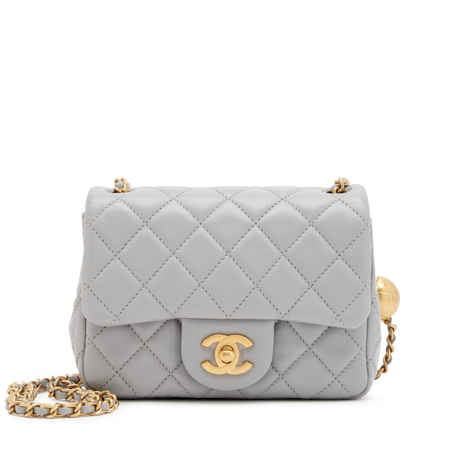 Chanel Grey Quilted Lambskin Pearl Crush Mini Flap Bag Aged Gold Hardware, 2021The interior is lined in a gold leatherIncludes information booklet, ribbon, felt protector, dust bag, and boxThis item is final sale and not eligible for return