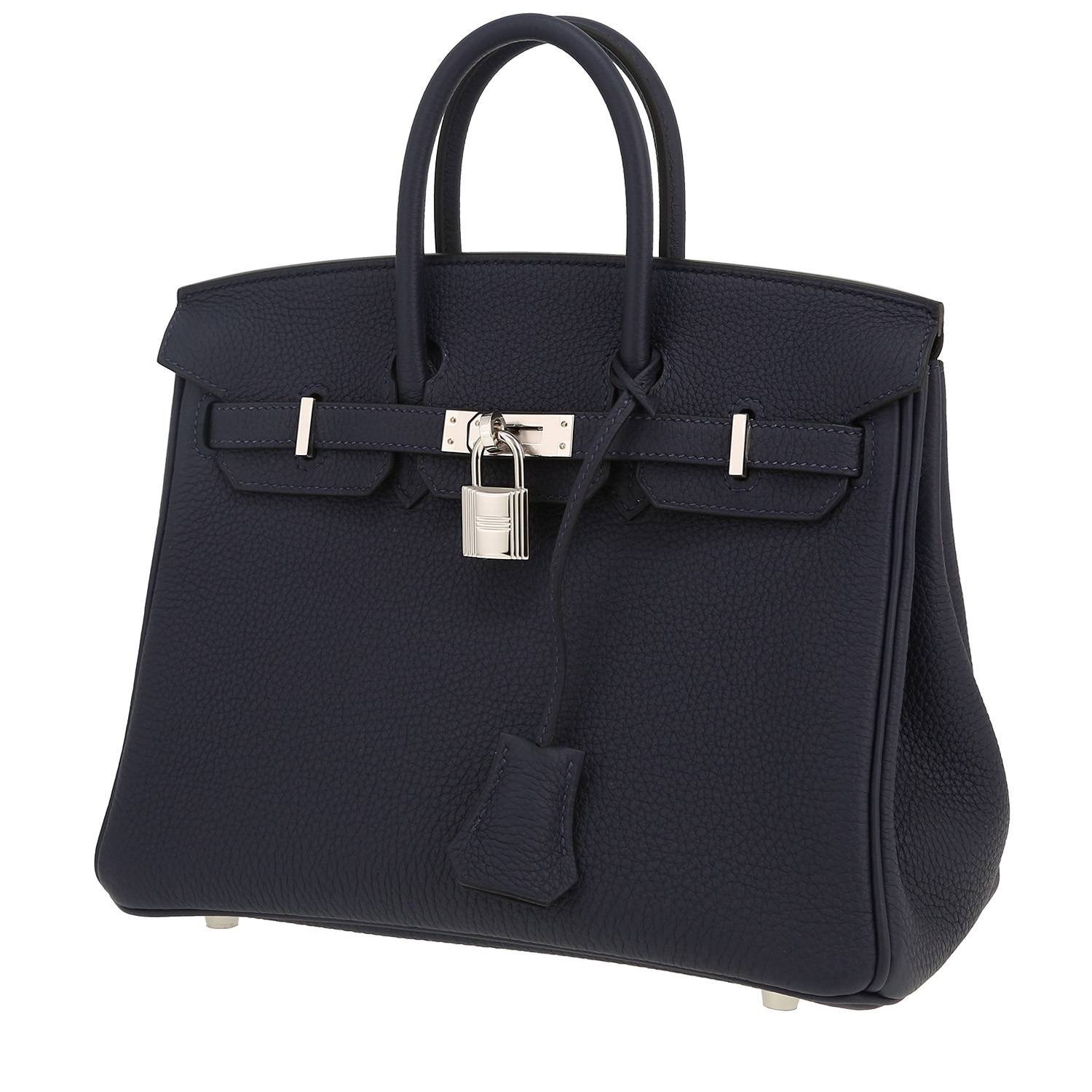 Wonderful Hermès Birkin 25 cm handbag in dark blue togo leather, hardware in palladium metal, double handle in dark blue leather allowing the bag to be worn in the hand.