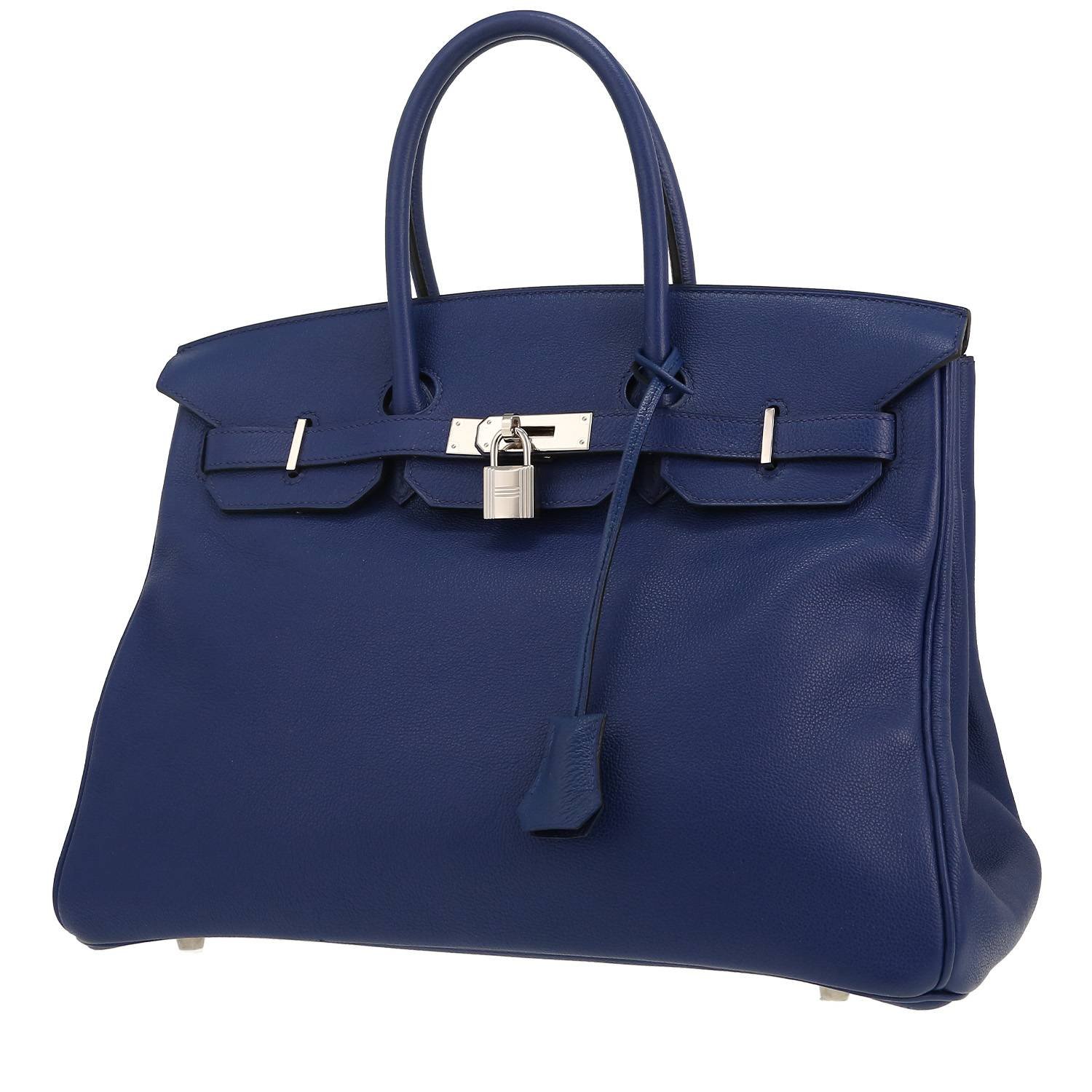 Elegant Hermès Birkin 35 cm handbag in blue Evergrain leather, hardware in palladium metal, double handle in blue leather allowing the bag to be worn in the hand.